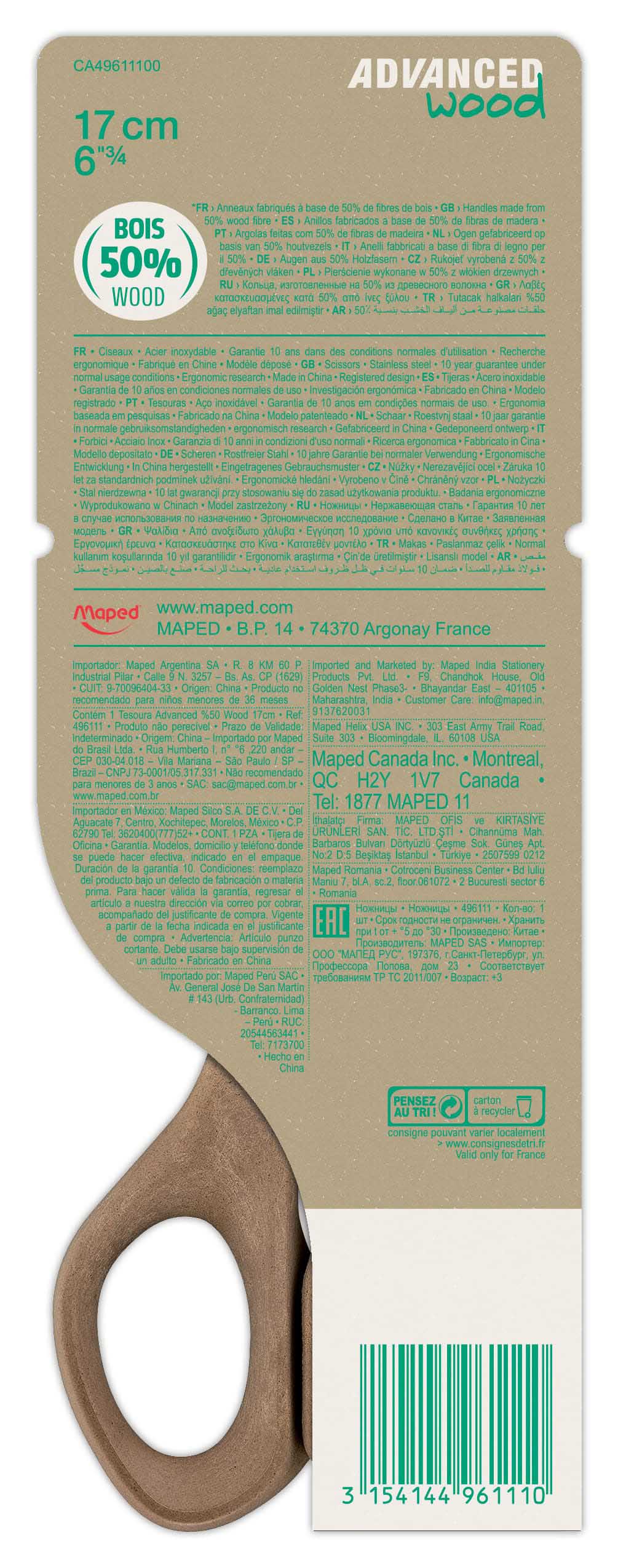 Maximize your cutting performance while minimizing your impact on the earth with the Advanced Wood Multipurpose Scissors! Ergonomic handles are designed to be comfortably used right or left-handed and are made of FSC-certified wood. 50% less plastic scissors are the perfect way to show you are eco-friendly! The super-compact, 6.75 inch blades are ideal for precise jobs and the razor-sharp edge makes quick work of all paper, cardboard, cardstock, fabric and more! Backed by a 10 year guarantee, the durable Stainless Steel construction will not rust or tarnish with age so you will always have a smooth and accurate scissor to get the job done.