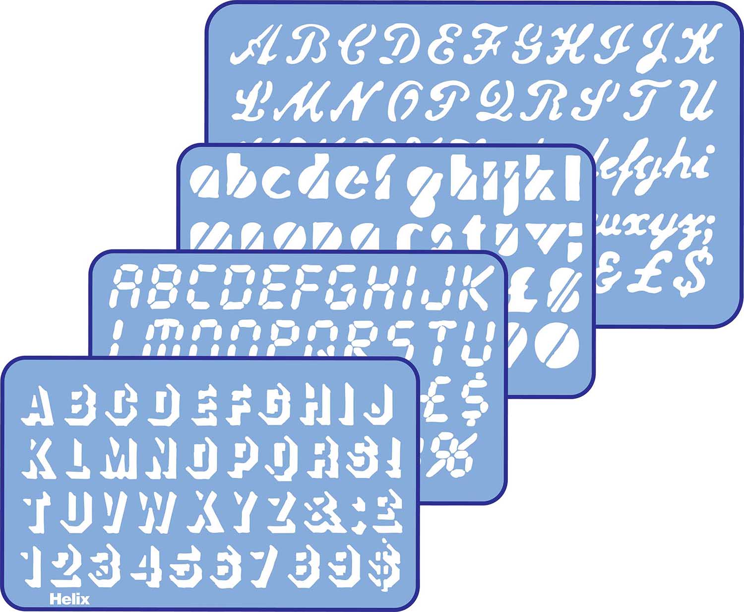 Assorted Font Lettering Guide Kit includes 4 plastic lettering guides with a Script, Digital, Shadowed & Striped font style! Each style includes unique sets of numbers and common symbols to match the font theme! Vertical & horizontal guidelines help with spacing and ink risers on reverse side prevent smudging. Translucent plastic construction makes it easy to line up and space letters during use.