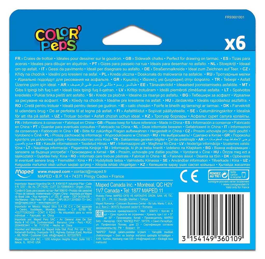 Maped Color’Peps Oversized Sidewalk Chalk are the perfect way to spend a fun day coloring outside! Blocky, square chalks feature molded tips for detail work and 4 flat sides for shading, and the 6 vibrant & fun colors really pop on concrete and brick! When coloring is done easily wash away the chalk with just a hose or water. Great for any age-