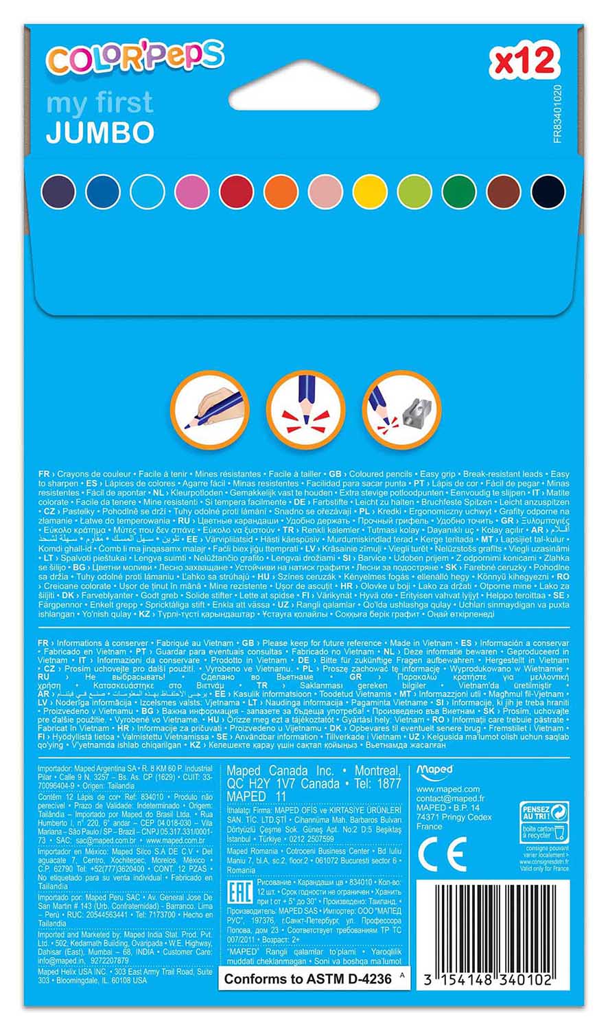 Supersized Jumbo Triangular Colored Pencils have an extra-thick triangular shape that is easy to grip – perfect for young artists and those who might struggle with gripping a standard pencil. Perfect for early learners, young children, Art Therapy, Pre-School, Special Needs and more! 5mm pigments are designed to be break-resistant but still provide smooth and soft laydown, and the triangular shape is recommended most by teachers because it guides fingers to a proper writing grip and promotes more purposeful and controlled drawing. Sharpens easily in all standard 2 hole pencil sharpeners! Set includes 12 vibrant, fun colors: Black, Woody Brown, Jungle Green, Golf Green, Sunny Yellow, Blush, Fruity Orange, Red Kiss, Lovely Pink, Aubergine, Marina Blue, and Bubble Blue.