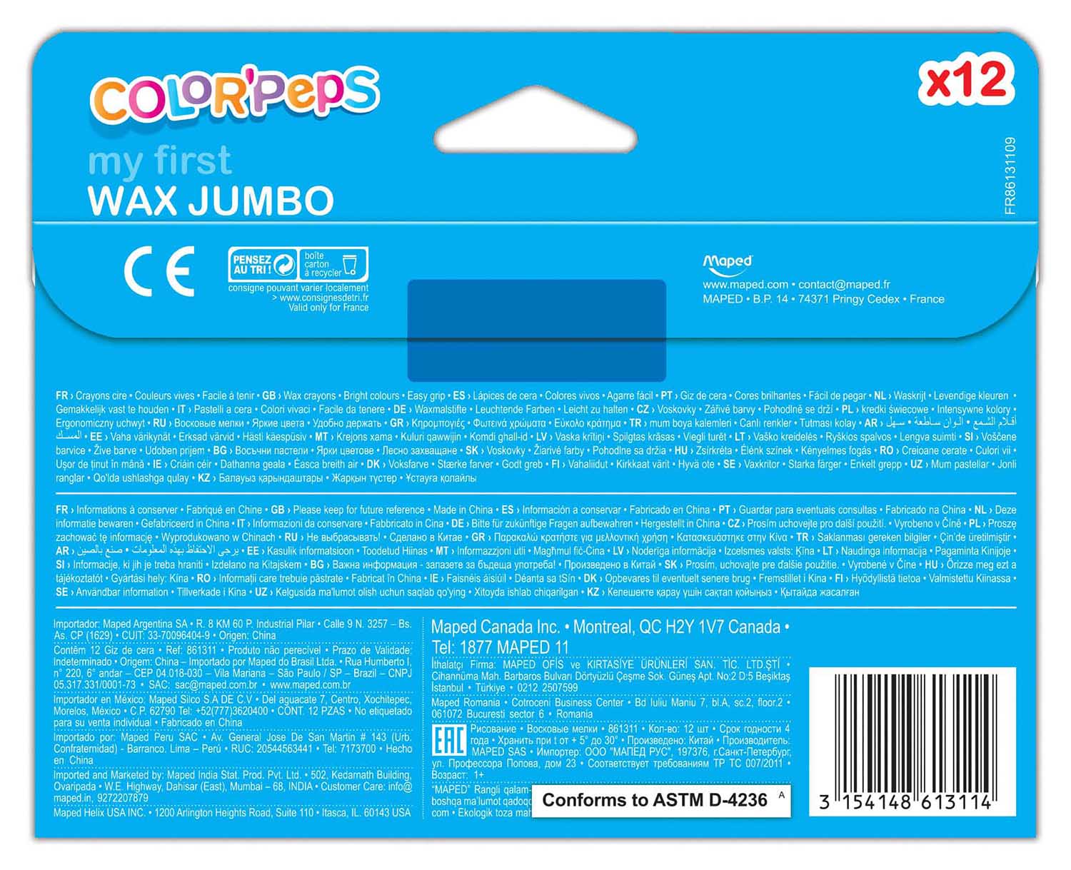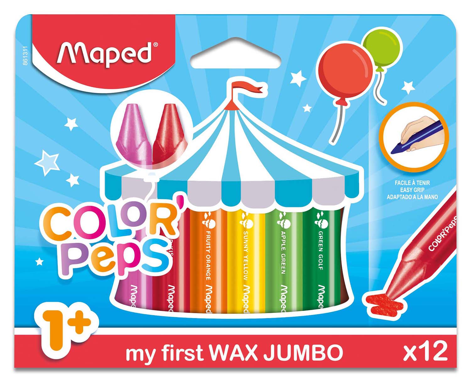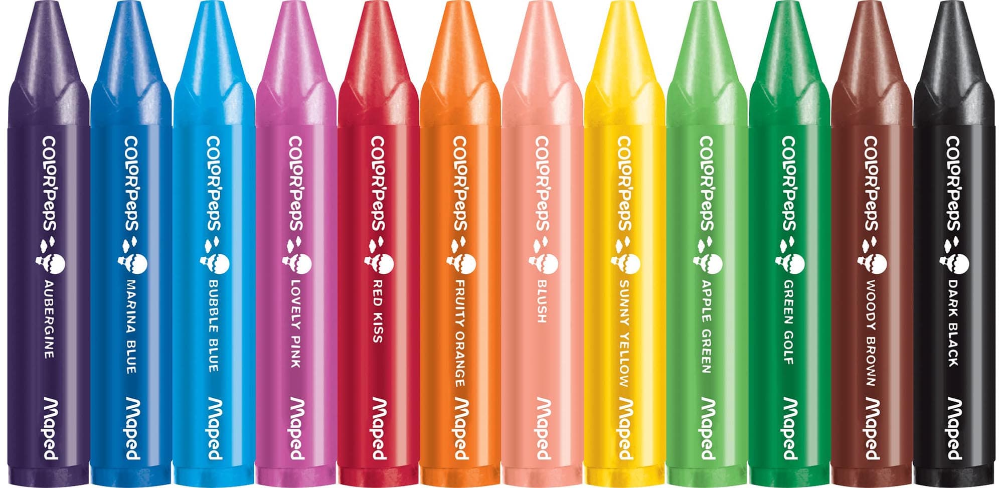 My First Jumbo Wax Crayons have an easy-grip triangular shape that is perfect for young hands! Oversized crayons (3 ½ x 5/8 inches) resist breakage and the triangular shape promotes writing-readiness skills. Super-soft wax lays down color smoothly and easily on all paper types, with bright vibrant colors that leap off the page. Paper-wrapped crayons will not make a mess and easily sharpen in any oversized crayon sharpener. Pack includes the following colors: Aubergine, Marina Blue, Bubble Blue, Lovely Pink, Red Kiss, Fruity Orange, Blush, Sunny Yellow, Jungle Green, Green Golf, Woody Brown & Black.