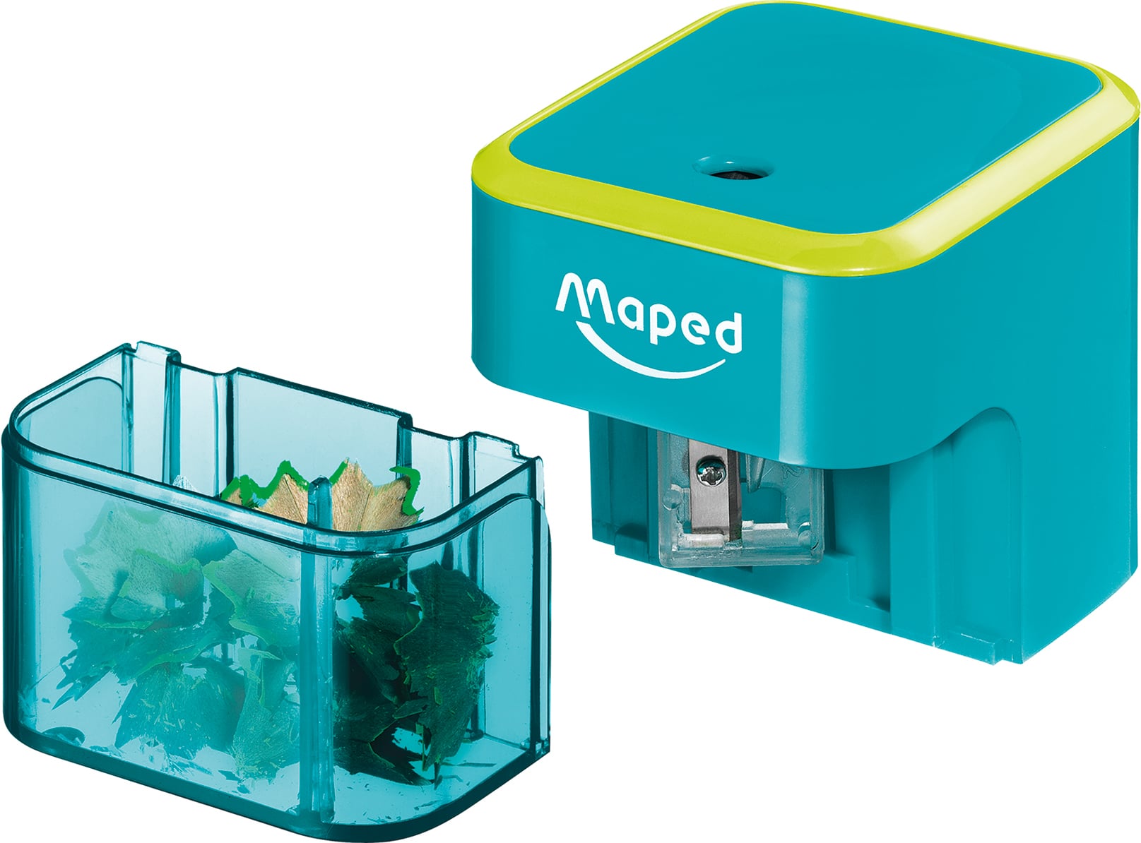 The Maped Compact 1 Hole Battery Powered Pencil Sharpener is perfect for school, home or office use! Top mounted sharpening hole makes it easier to guide the pencil in, and a unique clutch mechanism lets you still use the sharpener as a manual sharpener even if the batteries die. The compact shape is great for desks and drawers and the bright, fun coloring helps add a pop of color to your work area! Sharpens all shapes of standard pencils, including graphite, wood-free & even colored pencils! Operates on 4 “AA” batteries (not included) and features a translucent removable shavings container so you can see when it needs to be emptied.