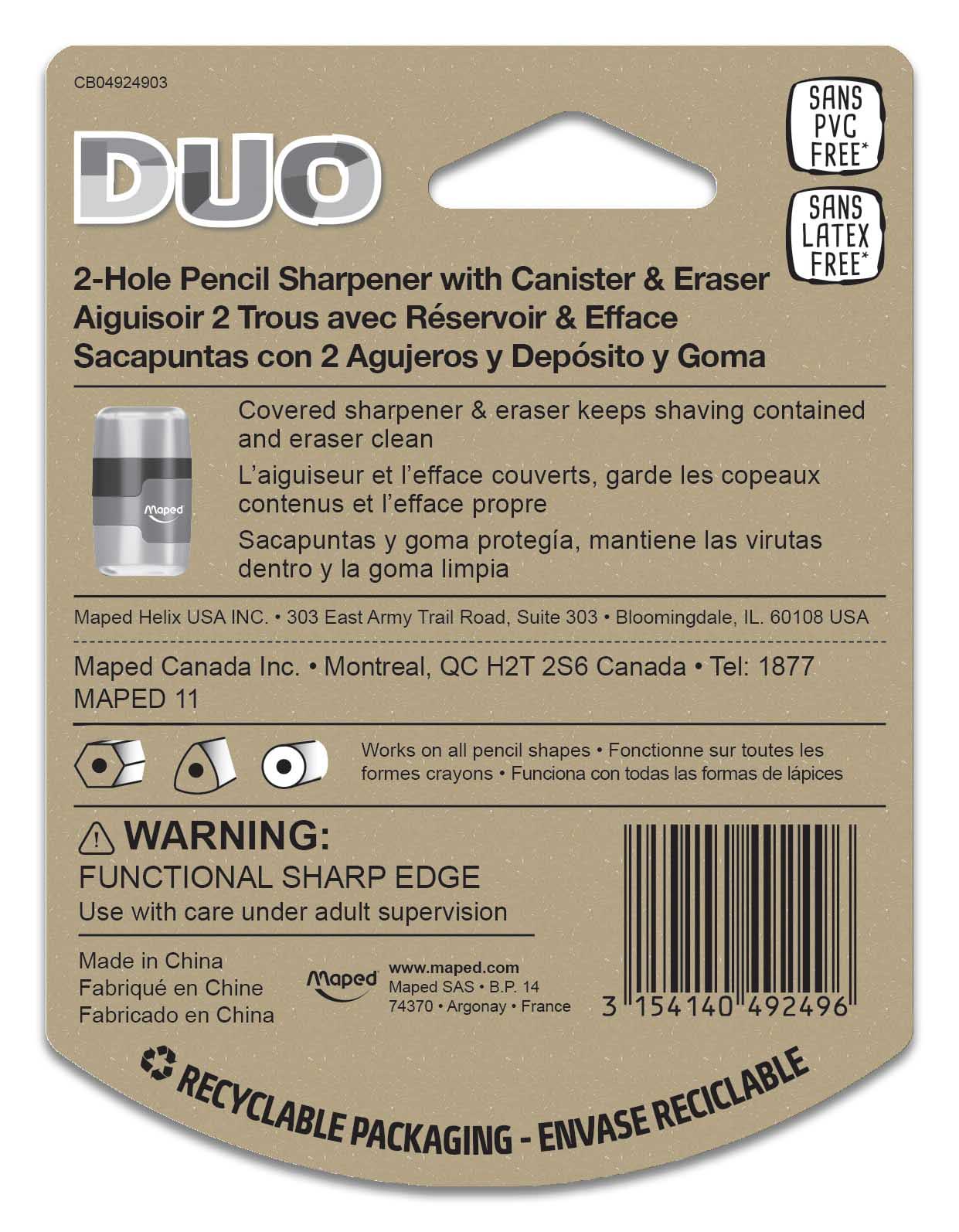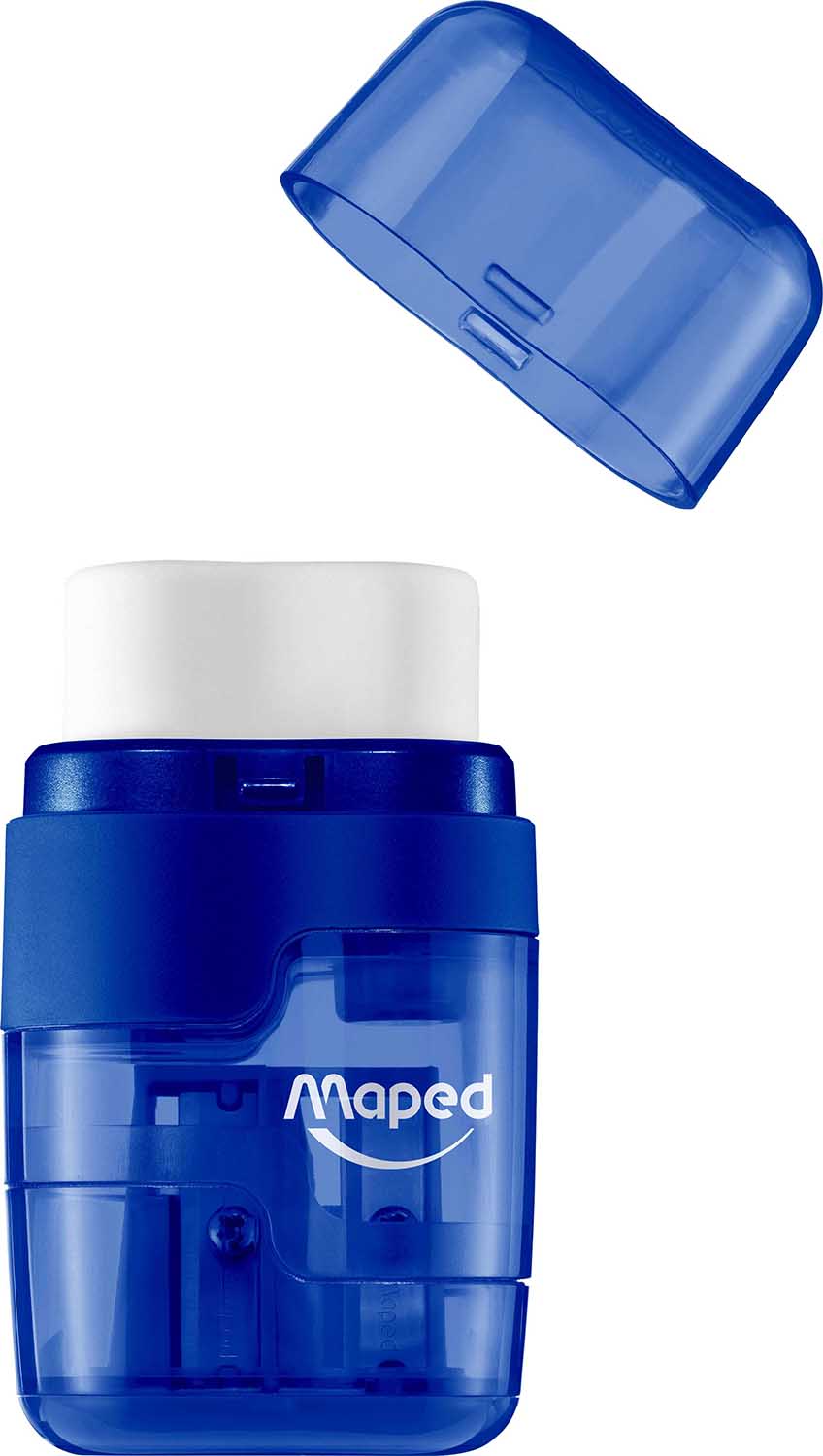 The Maped Connect DUO 2 Hole Sharpener & Eraser easily separates into two pieces – mix and match the colors to create your own! Remove the top cover to find a super-soft eraser, and flip open the bottom cap to access the 2 hole pencil sharpener for standard & jumbo sized pencils! With a body made of shatter-resistant, transparent plastic it’s always each to tell when you need to empty the shavings canister. Eraser is Latex, PVC & Phthalate free. Comes in assorted colors (Blue, Green & Pink) and cannot be chosen at this time.