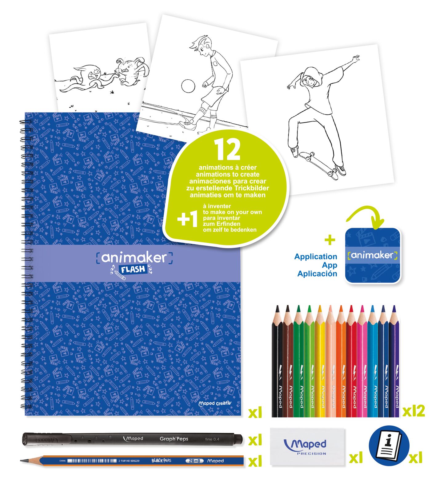 Animate your drawings thanks to Animaker Comic Strip Kit and FREE App! Color in the comic strips, add text & other customizing, and then use the FREE app to bring them to life as a .GIF! Kids color complete or invent their own stories for an unique & ‘WOW’ result to keep or share! Innovative way for kids to share their creativity & art in a digital world – Animaker App automatically converts comics! Contains 1 Notebook with 12 comic strips, 12 Color’Peps Triangular Colored Pencils, 1 Graph’Peps Felt Tipped Pen, 1 Black’Peps Graphite Pencil, 1 Vinyl Eraser & Link to FREE Animaker App. Dimensions: 0.6” x 8.5” x 12.2”