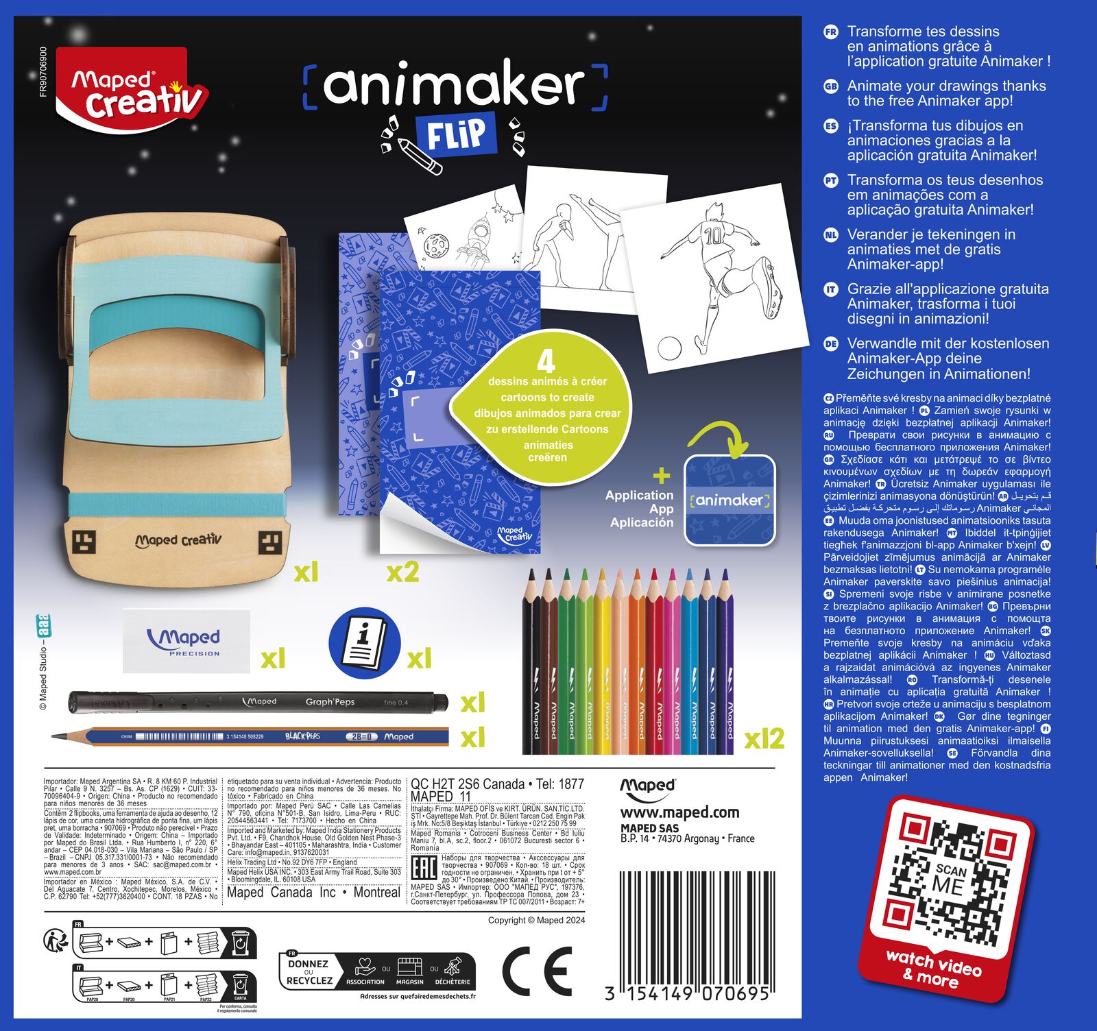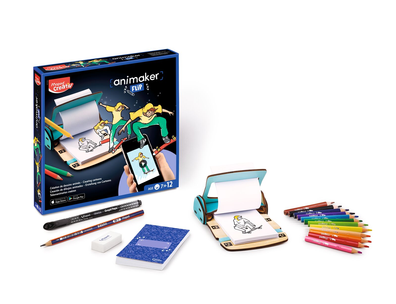 Animate your drawings thanks to Animaker Flip Comic Drawing Pad Kit and FREE App! Color in the comic flipbooks, add text & other customizing, and then use the FREE app to bring them to life as a .GIF! Kids color complete or invent their own stories for an unique & ‘WOW’ result to keep or share! Innovative way for kids to share their creativity & art in a digital world – Animaker App automatically converts comics! Contains 4 Comic Flip Drawing Pads, 1 Pad Holder, 12 Color’Peps Triangular Colored Pencils, 1 Graph’Peps Felt Tipped Pen, 1 Black’Peps Graphite Pencil, 1 Vinyl Eraser & Link to FREE Animaker App. Dimensions: 1.5” x 8.8” x 8.3”
