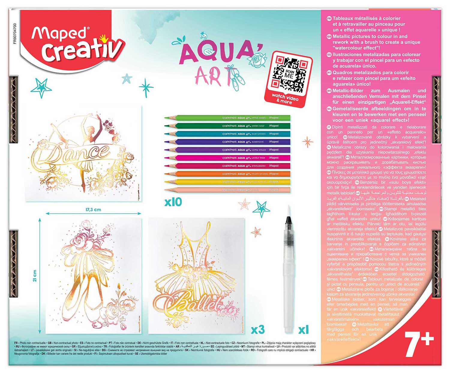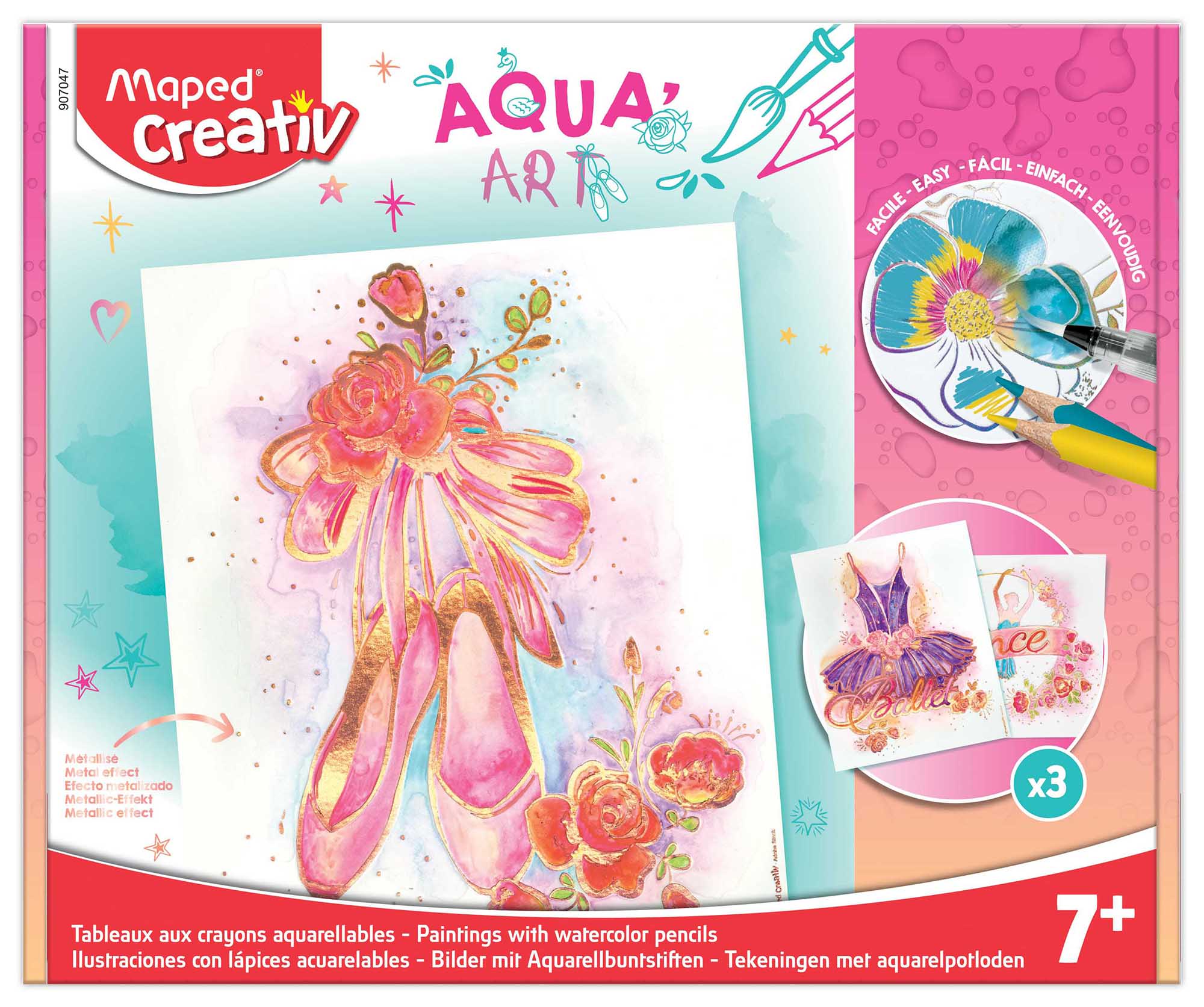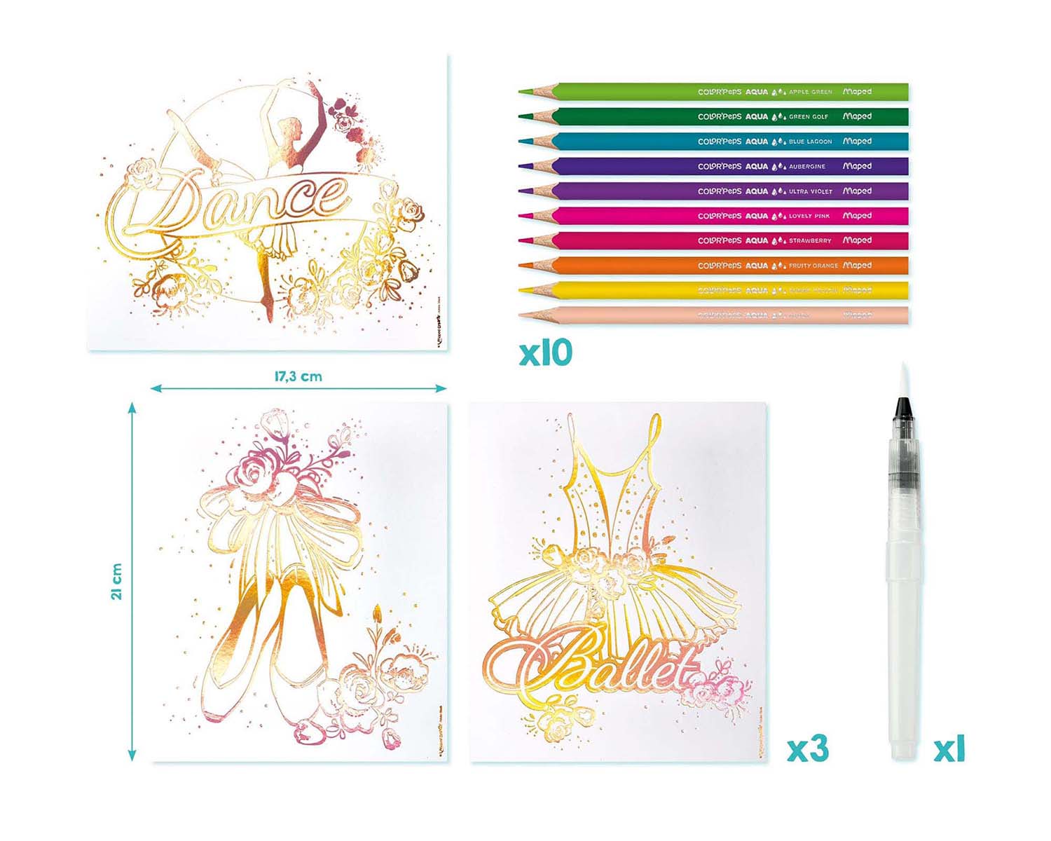 Create stunning works of art with the Aqua’Art Metalized Watercolor Art Set! The paper has been pre-printed with Ballet-themed designs to color, and the metalized, shiny foil accents add a bright pop of color! Vibrant Color’Peps Triangular Watercolor Pencils are easy to color and blend with the included Water Blending Brush, and because there’s no ink nothing the coloring is mess-free and super easy to clean up! The complete kit contains everything you need to create your own beautiful works of art: 3 Metalized Drawings to Color, 10 Color’Peps Triangular Watercolor Colored Pencils & a Water Blending Brush.