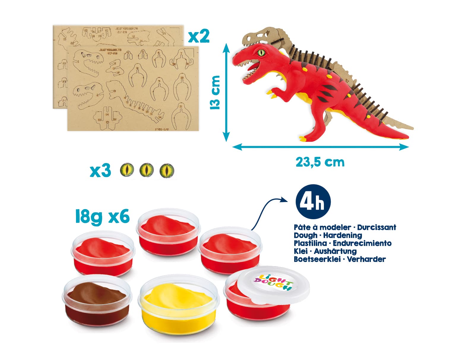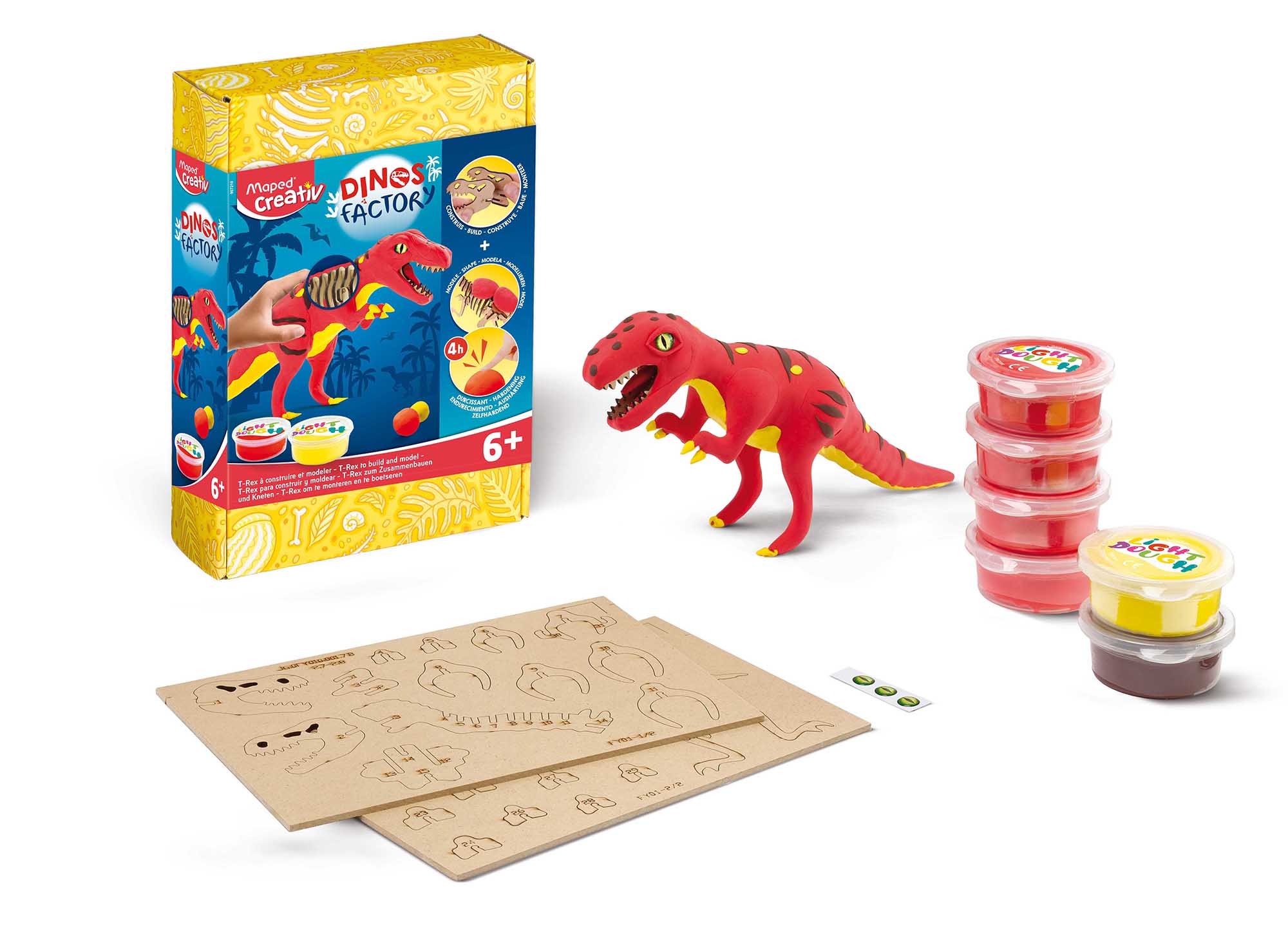 Bring your very on ferocious T-Rex to life with the Maped Creativ Dinosaur Factory Kit! A two-part activity, you first assemble the dinosaur’s skeleton by easily snapping together the wooden puzzle pieces, no glue needed. Then, using the included Light Dough you sculpt your very own dinosaur by applying the quick-drying modeling dough when you want it, using the skeleton as a guide. Super soft, airy dough is fun and easy to work with and dries in just a 4 hours – no oven needed! The complete kit contains everything you need to decorate and then play: Laser-Cut 3D Wooden Skeleton to assemble, 6 pots of Air-Hardening Modeling Doug & 3 eyes all packed in a reusable decorated box.