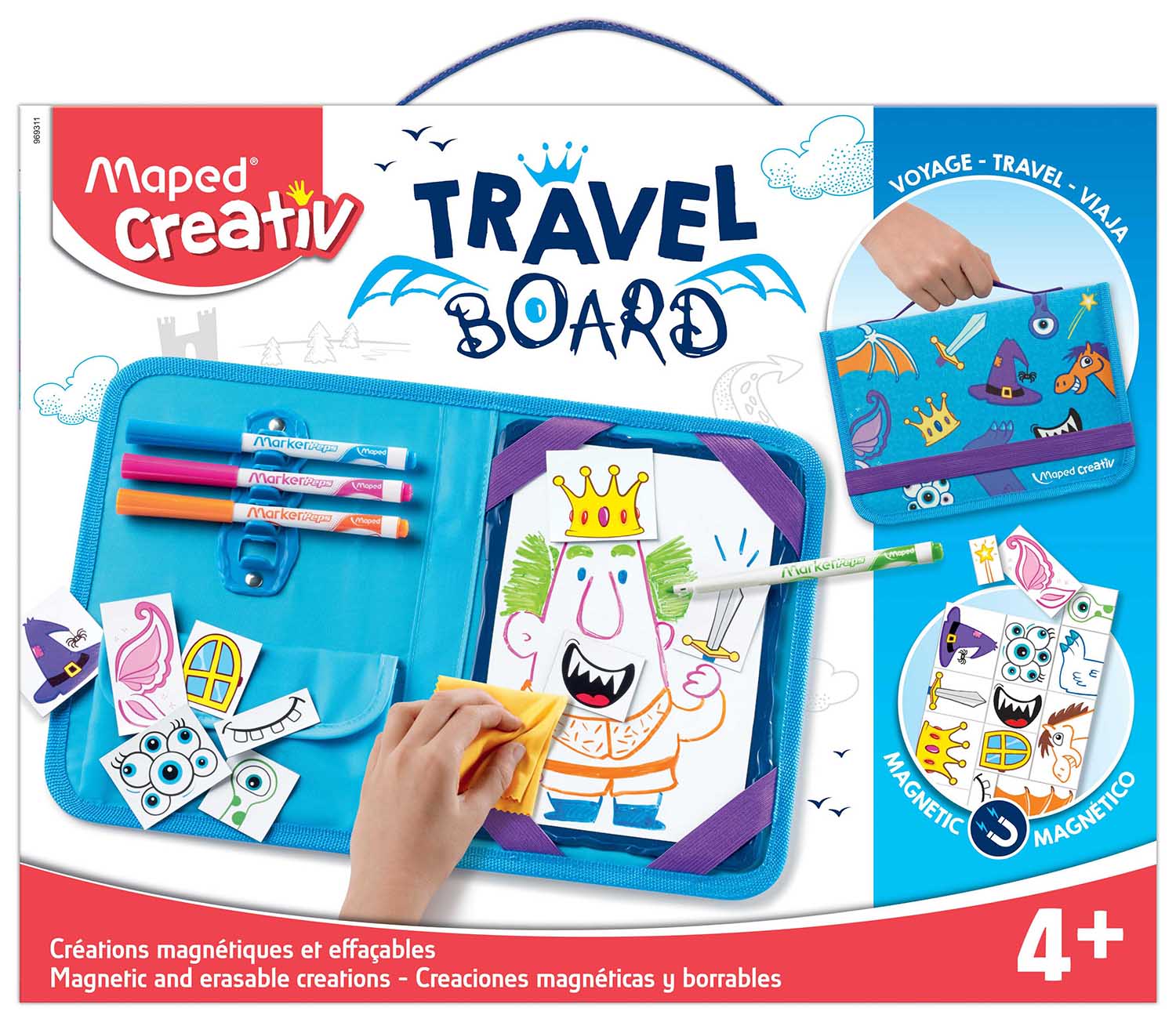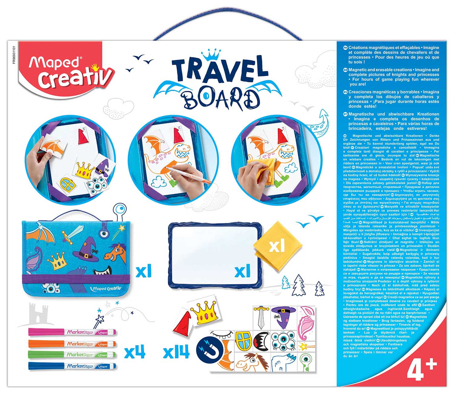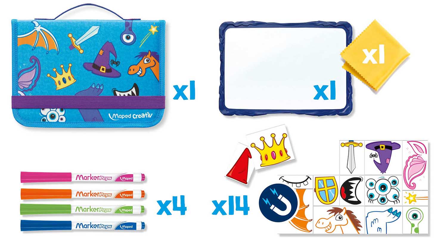 Perfect for use on-the-go, the Maped Creativ Transparent Travel Board helps children build cognitive and drawing skills anywhere! Slip the included activity sheets behind the unbreakable transparent dry erase board for hours of fun solving mazes, connecting the dots and more, and then wipe everything up with the included cloth. And everything is easy to store, with integrated straps, clips and a pocket to make sure nothing gets lost! The complete kit contains everything you need to decorate and then play: 1 All-in-One case, 1 unbreakable transparent dry erase board, 4 Maped Marker’Peps Dry Erase Markers, 11 magnets and 1 microfiber cleaning cloth.