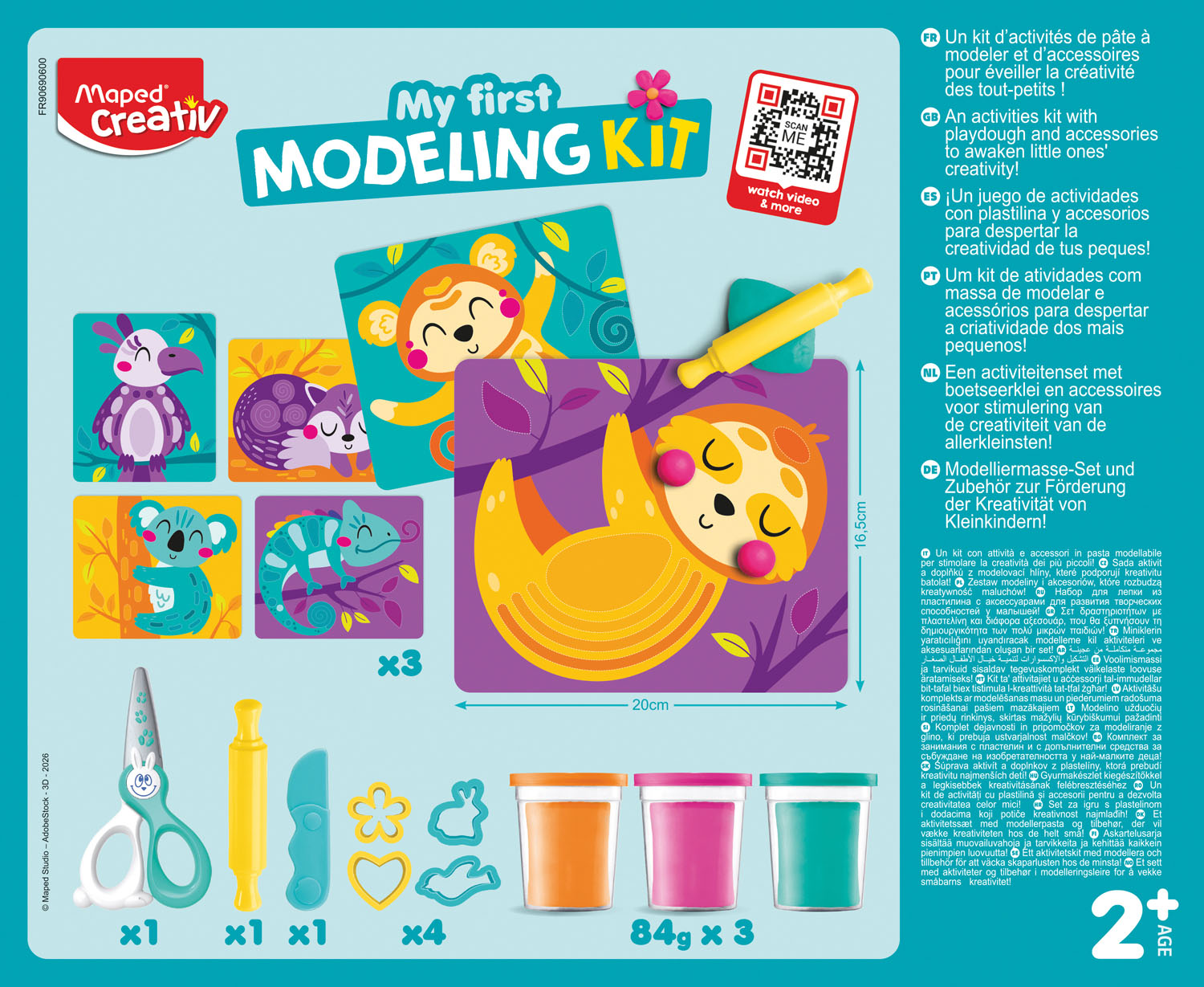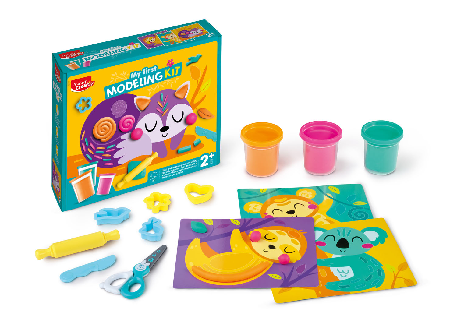 Perfect for toddlers, this 13 piece kit will allow your child to explore the world of dough with a activity specifically designed for children ages 2+! Vibrant dough lets children develop their dexterity and imagination, giving the child free rein to decorate the animals on the included character cards however they’d like. To help children manipulate the bright & fun dough the kit includes a plastic knife, shape cutters, roller and Maped KidiCut Safety Scissors which will not cut hair, skin or fabric. Once the activity is over, the items are easily stored in included recyclable box/ Kit includes: 3 3oz Dough pots, 3 double-sided character cards, plastic knife, shape cutters, roller and KidiCut Safety Scissors.