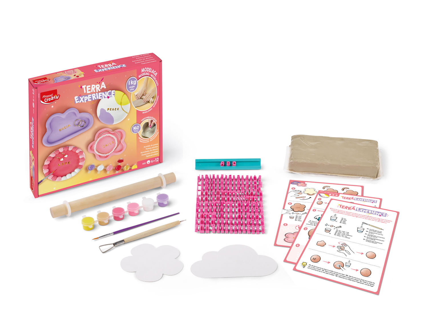 Maped Creativ Terra Experience lets your child explore the world of pottery with this all-in-one clay modeling kit! Designed for children aged 7 and up, Terra Experience offers a fun and rewarding activity where kids can shape, decorate, and personalize up to four unique jewelry holders. Using the included modeling tools & reusable pattern, children follow step-by-step activity cards to sculpt their clay bowls. With over 160 alphabet stamps, they can add names, kind words, or messages to give each piece a personal touch. Once dry, the creations can be painted to express their style and creativity. This thoughtful kit encourages calm, screen-free play while helping kids build fine motor skills, patience, and creative confidence. Its minimal water usage, refillable clay, and recyclable storage box make it a sustainable and easy-to-manage activity, ideal for solo crafting or shared family time. The kit includes a reusable shaping pattern, natural clay, two modeling tools, 160 letter stamps, four illustrated step-by-step activity cards and an instruction booklet.