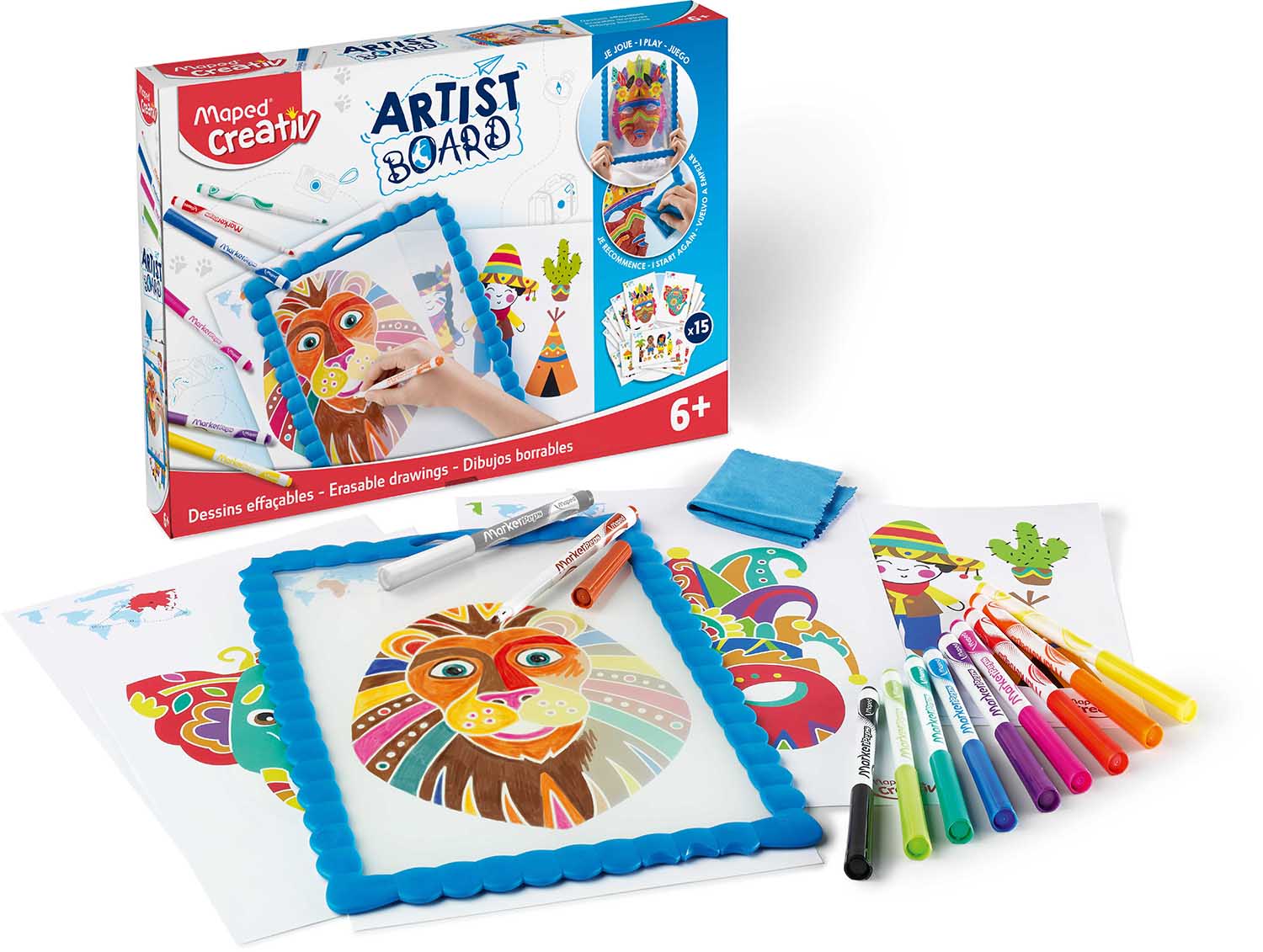 The Maped Creativ Transparent Artist Board is a great way for children to show off and play with their creativity in a fun way! By tracing and coloring in the included fun “”mask”” designs directly onto the unbreakable dry erase board, children can design their very own masks for hours of fun! When the game is over, simply wipe everything up with the included cloth. Markers feature bright, vibrant inks that are low-odor and easy to erase, and work with any other standard dry-erase board too! The complete kit contains everything you need to decorate and then play: 1 unbreakable transparent dry-erase board, 15 “”mask”” designs, 10 Maped Marker’Peps Dry Erase Markers, 1 Correction Marker to clean up design and 1 microfiber cleaning cloth.