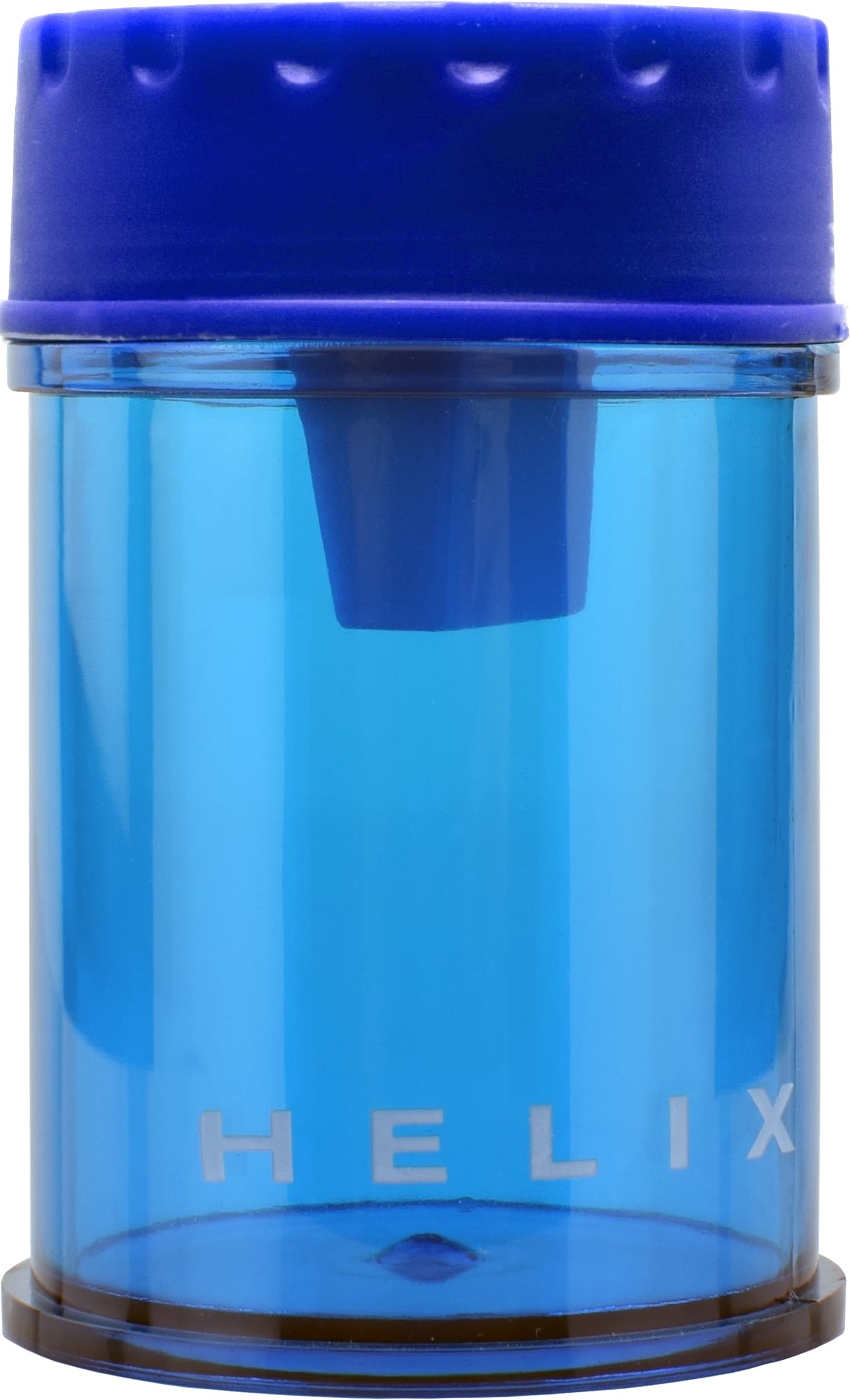 Keep your pencils sharp with the Helix Cylindrical 2-Hole Canister Pencil Sharpener! The 2 high quality steel blades are mounted in a metal sharpening insert to easily sharpen all standard and jumbo pencils, and the integrated canister keeps all the shavings contained. Simply unscrew the cap to empty the large translucent, shatter resistant canister when it gets full. Perfect for use at the office or at a desk, the flat canister base and circular shape make it easy to grab and use! Comes in assorted colors (Blue & Grey)
