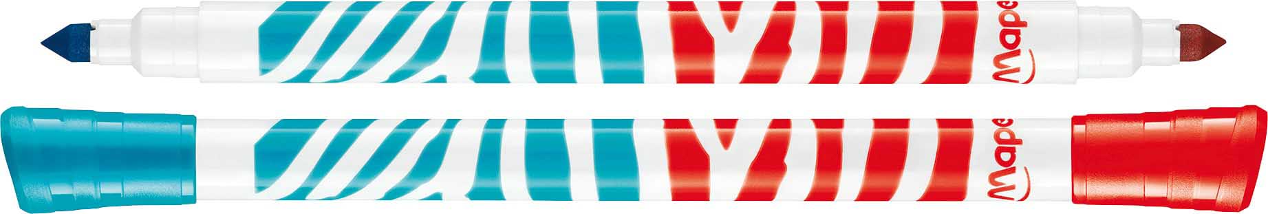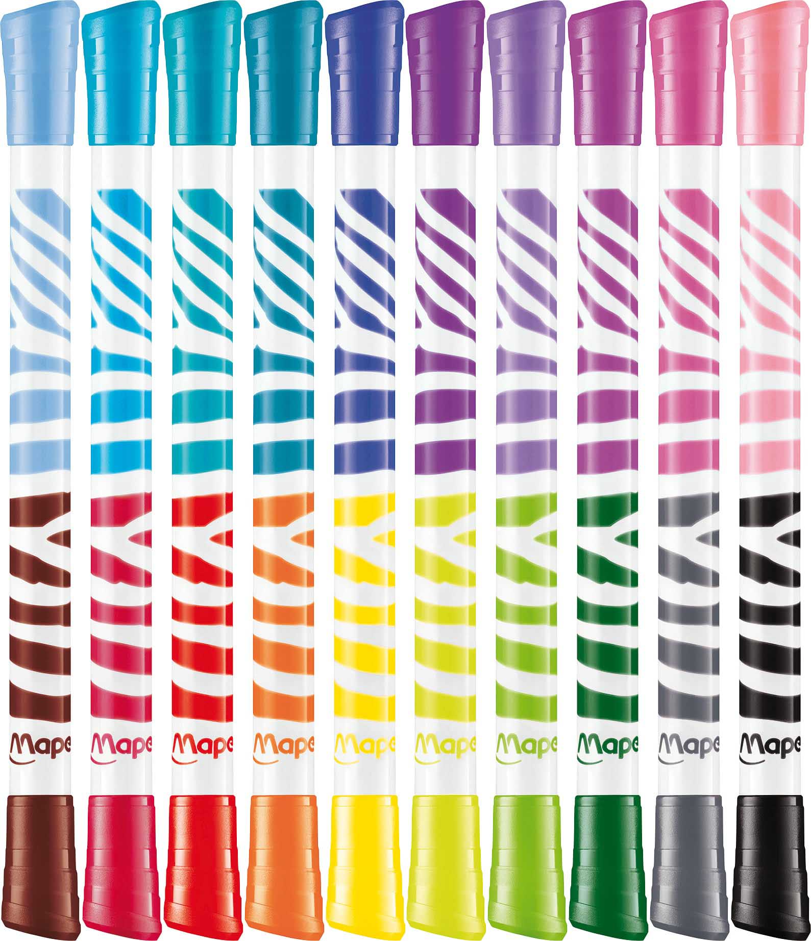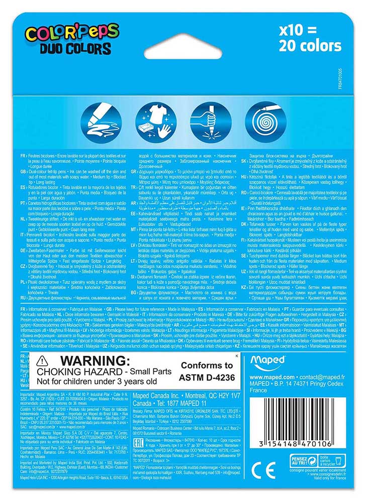 Smart and practical double-tip design means Color’Peps DUO Color Ultrawashable Markers offer twice the colors in half the space! Super vibrant, fun colors let you bring any drawing to life, and the Ultrawashable ink is easy to remove from most fabrics and surfaces with warm soap and water, making cleanup a snap! 3.6mm conical felt tip is small enough for detailed work but wide enough to quickly color whatever you want. Non-toxic and totally safe, these markers feature a ventilated cap for safety and contain the following 20 colors: Blue Sky + Woody Brown, Bubble Blue + Red Kiss, Blue Lagoon + Light Red, Azure Blue + Fruity Orange, Marina Blue + Sunny Yellow, Ultra Violet + Fluo Yellow, Marshmallow + Apple Green, Sweety Purple + Green Golf, Lovely Pink + Gentle Grey, Pink Peach + Dark Black. Ships in plastic-free packaging.