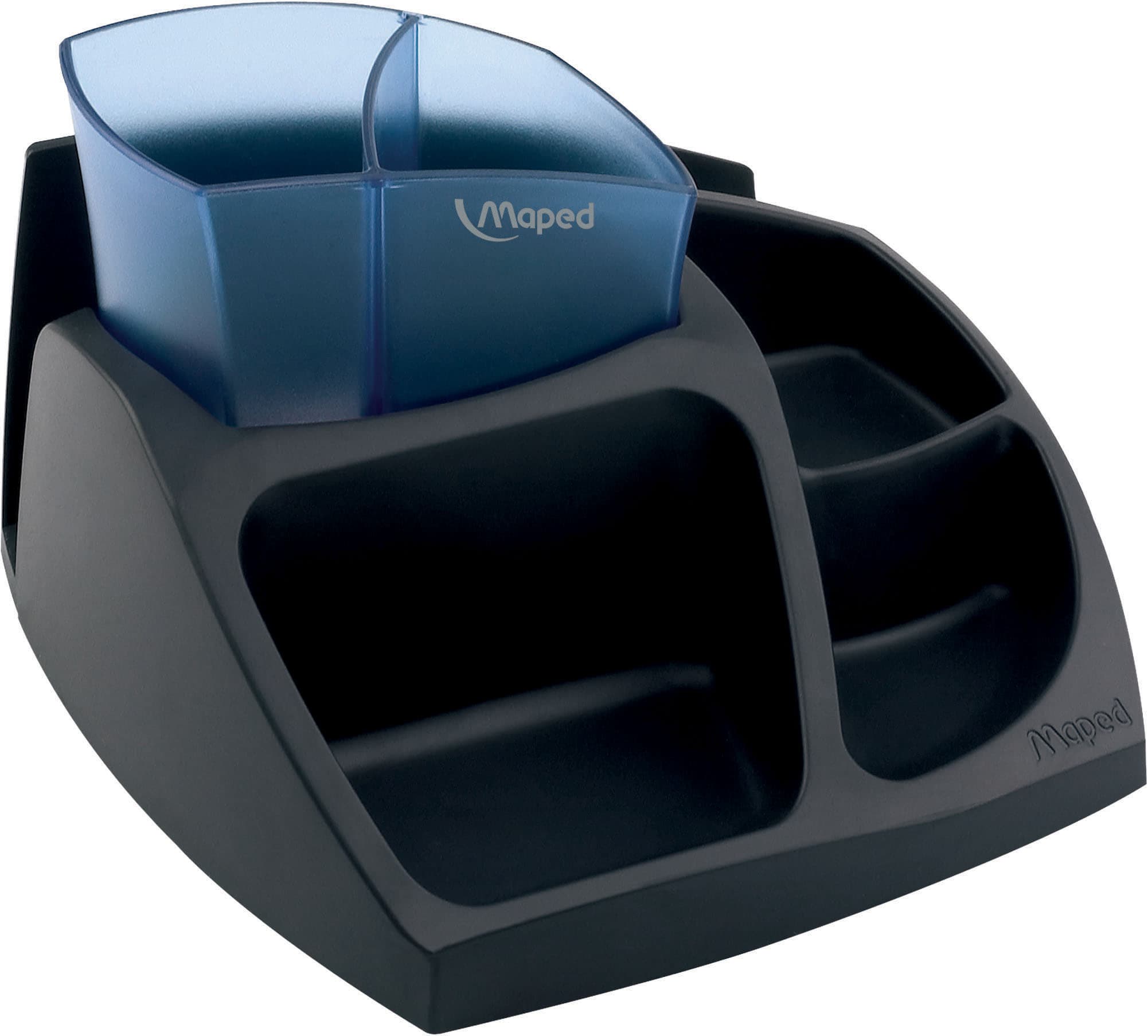 Minimize your environmental impact with the Compact Recycled Desk Organizer! Compact footprint features 6 storage compartments: 2 for small objects, 2 for pens and other tall items, 1 for note pads and 1 for paper in the rear of the organizer. Body is made of 55% recycled plastic with a removable blue pencil cup.