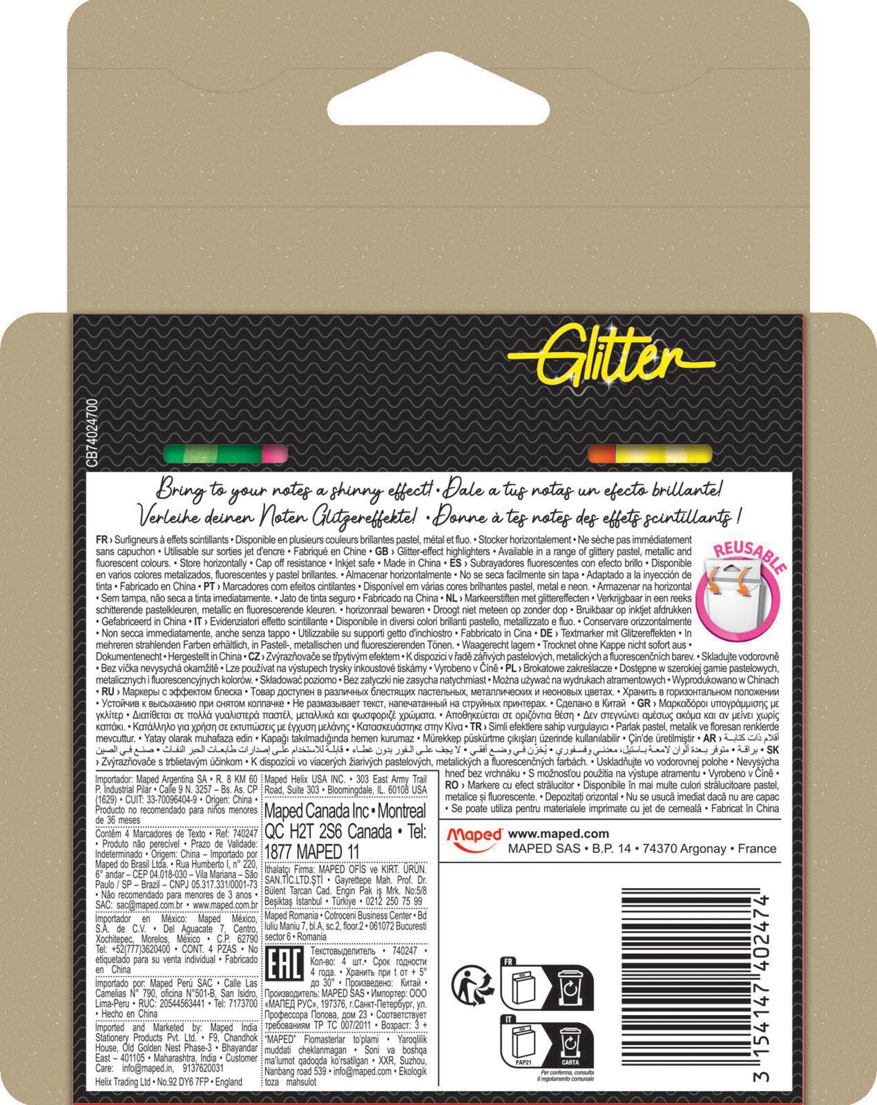 Take your note-taking experience to the next level with the brand new Fluo Pep Classic Fluorescent Glitter Highlighters! Super vibrant & sparkly highlighters really set you apart at school, home or office use! Their wide body fits comfortably in your hand and don’t roll of your desk, and the super shiny Highlighter ink really lets you show off your style! The soft, dual-beveled tip easily draws 5mm or 1mm lines depending on the side you hold the highlighter, and consistent ink dispensing make this highlighter the right tool for small or large jobs. Safe on all paper, inks, graphite, faxes, ink-jet printing and more! Set includes 4 highlighters in assorted colors: Yellow, Orange, Green & Pink.