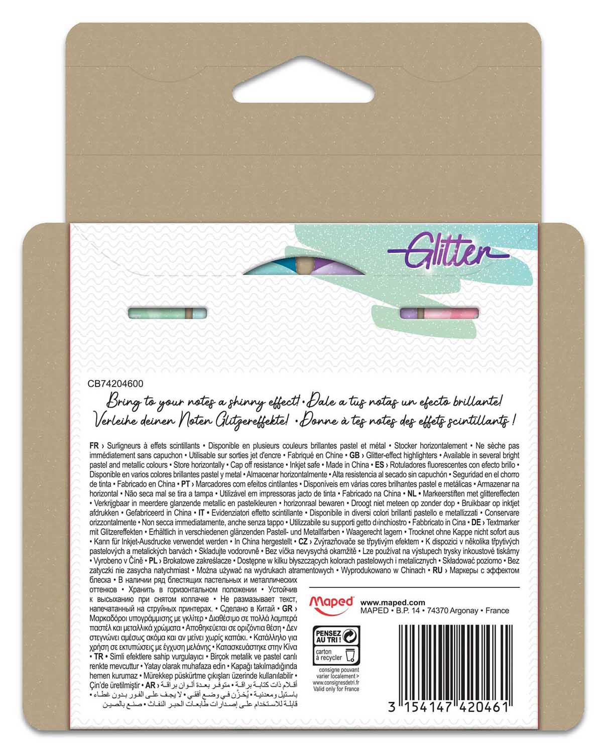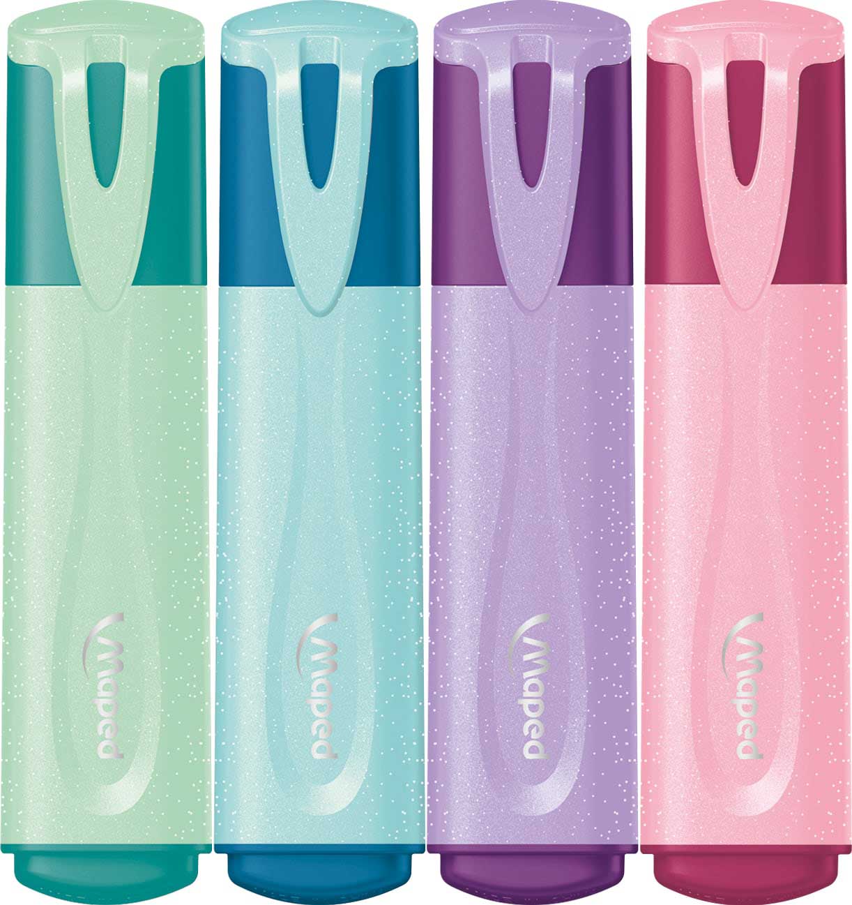 For an even more unique note-taking experience, turn to the brand new Fluo Pep Classic Pastel Glitter Highlighters! Super fun, sparkly pastel colors really set you apart at school, home or office use! Their wide body fits comfortably in your hand and don’t roll of your desk, and the super trendy Pastel ink really lets you show off your style! The soft, dual-beveled tip easily draws 5mm or 1mm lines depending on the side you hold the highlighter, and consistent ink dispensing make this highlighter the right tool for small or large jobs. Safe on all paper, inks, graphite, faxes, ink-jet printing and more! Set includes 4 unique Pastel Glitter colors (Blue, Green, Purple & Pink)!