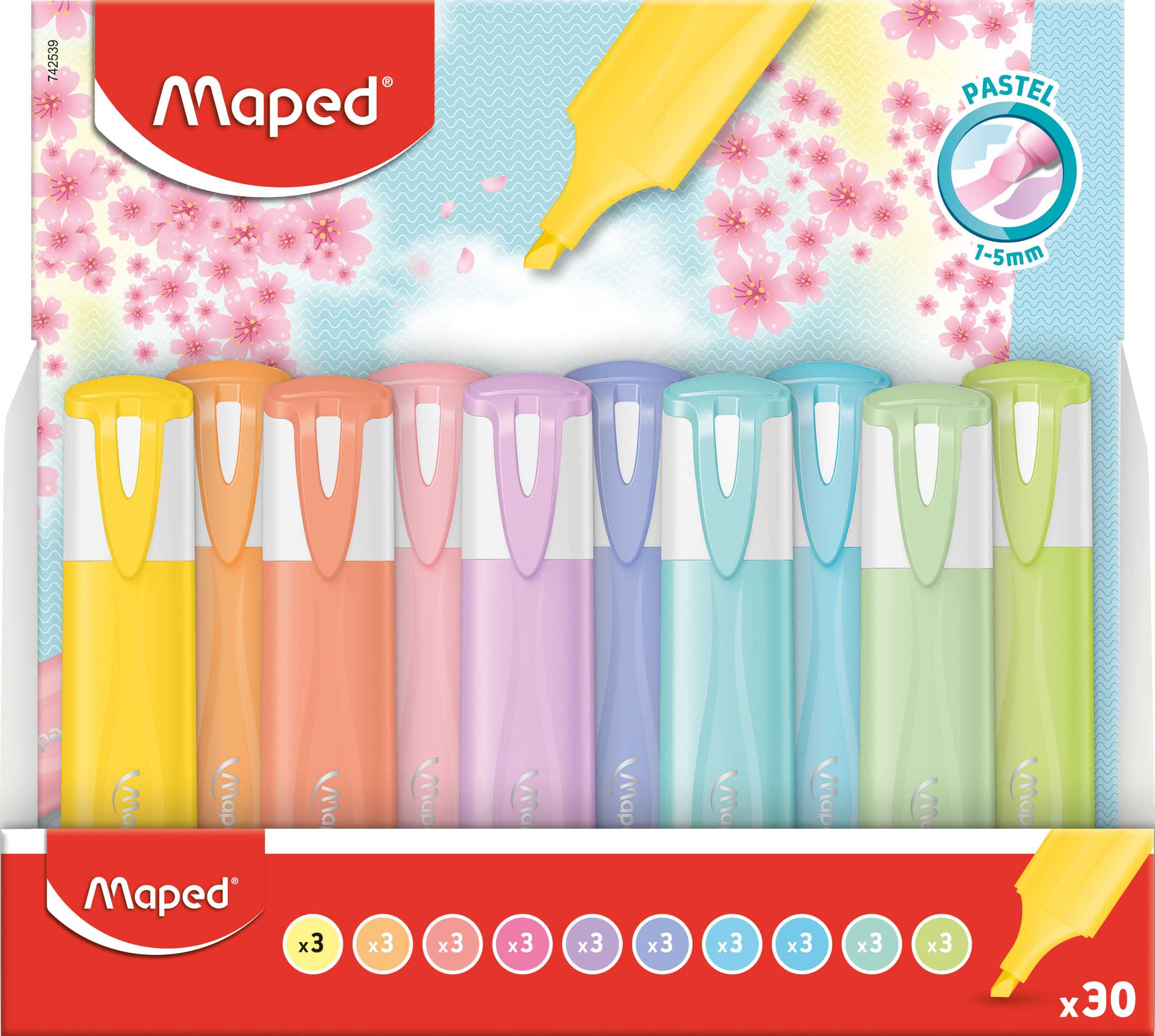Fluo Pep Classic Pastel Highlighters are a fun new take on highlighters, perfect for school, home or office use! Their wide body fits comfortably in your hand and don’t roll of your desk, and the super trendy Pastel ink really lets you show off your style! The soft, dual-beveled tip easily draws 5mm or 1mm lines depending on the side you hold the highlighter, and consistent ink dispensing make this highlighter the right tool for small or large jobs. Safe on all paper, inks, graphite, faxes, ink-jet printing and more! Highlighters will not dry up even if the cap is left off for up to 4 hours. 30 piece display includes 10 super vibrant and fun pastel colors (Yellow, Orange, Rose, Pink, Lavender, Periwinkle, Sky Blue, Blue, Jade, and Lime).