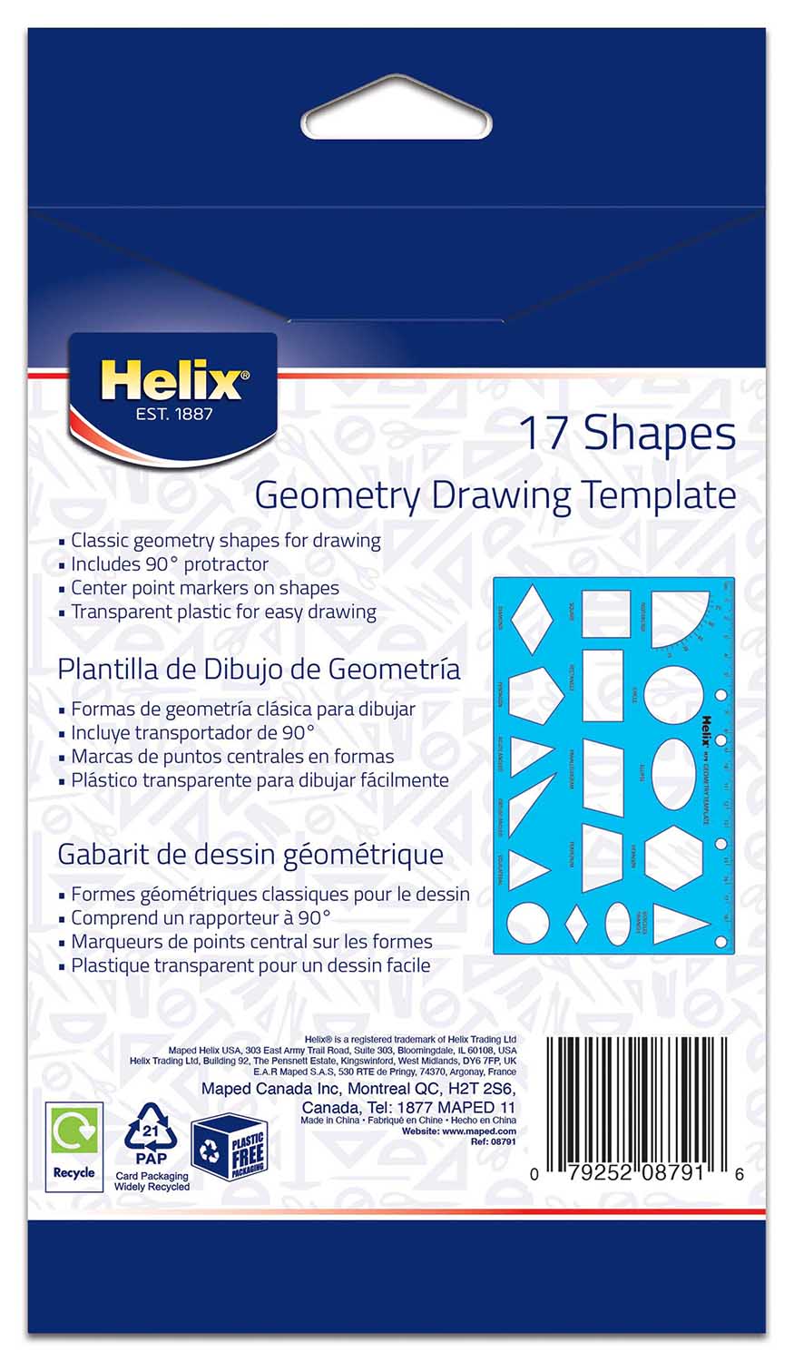 Geometry Shapes Drawing Template is perfect for young students learning shapes, geometry, mathematics and more! 17 total shapes are molded into the template body including triangles, hexagons, squares, circles & a 90° protractor. Durable, translucent & flexible plastic template feature ink risers on reverse side to prevent smudging and centering lines for marking center points Perfect for art, math, or geometry class! Dimensions: 4 7/8″ x 7 13/16″