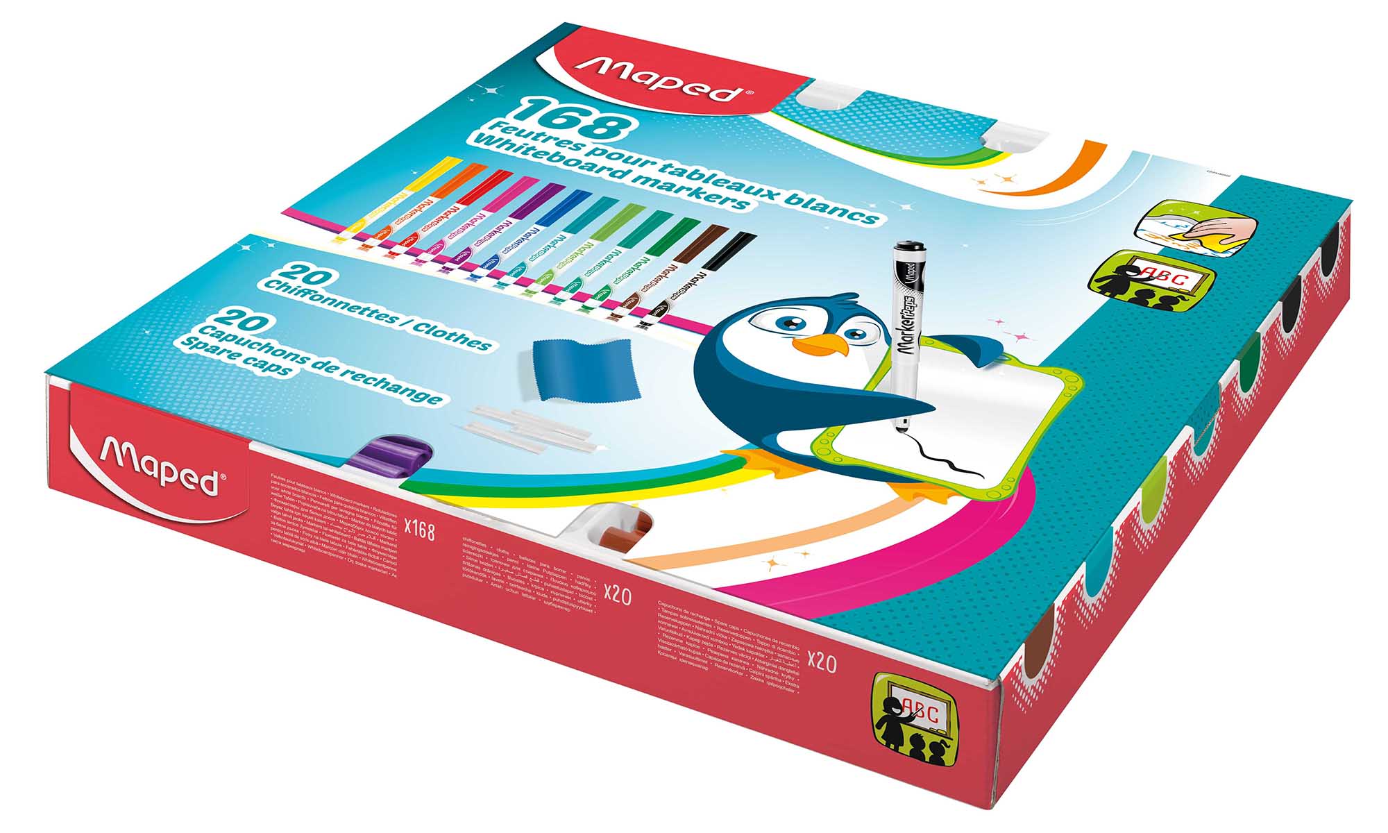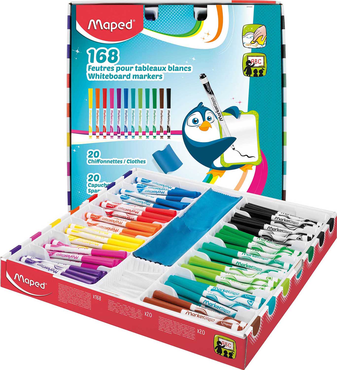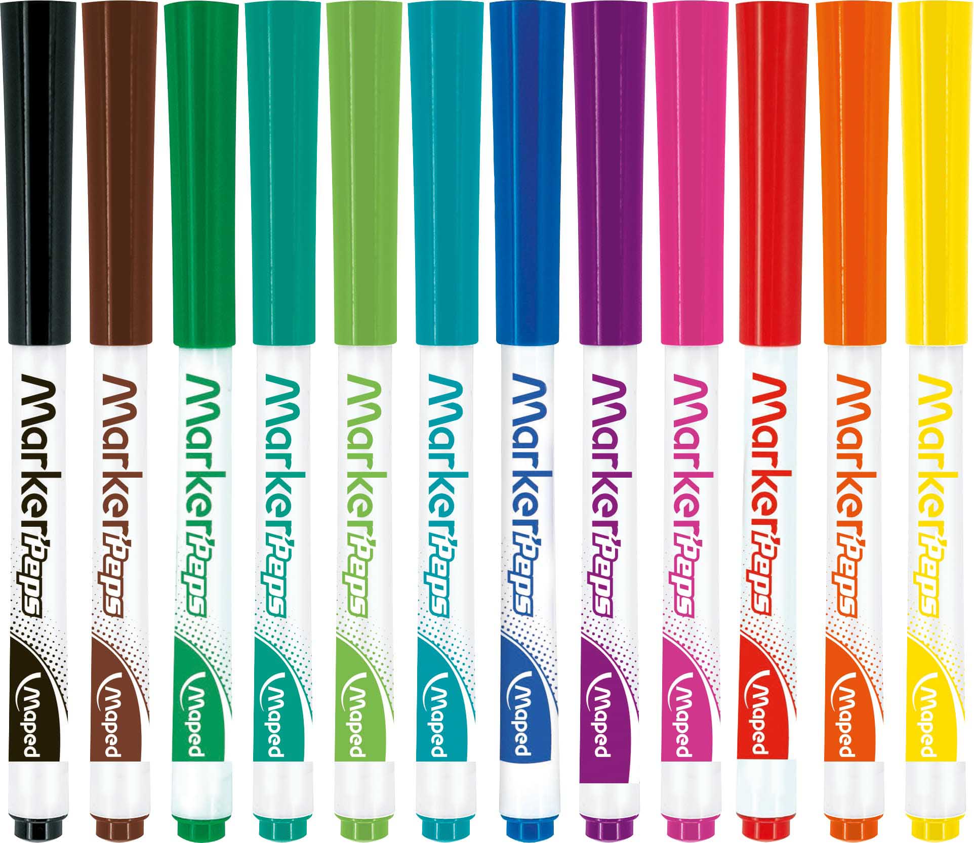 Maped Marker’Peps are a new range of fine tipped dry erase markers, perfect for school or the office! Super vibrant inks help make learning fun and encourage creativity with low odor so no headaches or safety concerns. Features a triangular grip for more comfortable writing and a fine Bullet tip. Ink easily wipes off all non-porous surfaces like whiteboards, blackboards & glass. School Pack contains 20 FREE replacement marker caps and Microfiber Cleaning Cloths, and include the following 12 colors: Black (x24), Brown (x12), Green (x12), Jade (x12), Lime (x12), Teal (x12), Blue (x24), Violet (x12), Pink (x12), Red (x12), Orange (x12) & Yellow (x12).