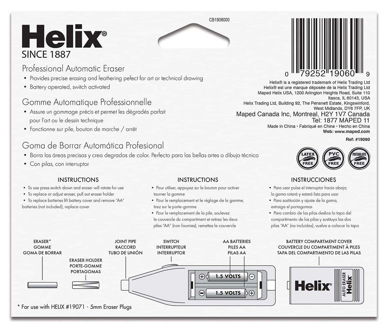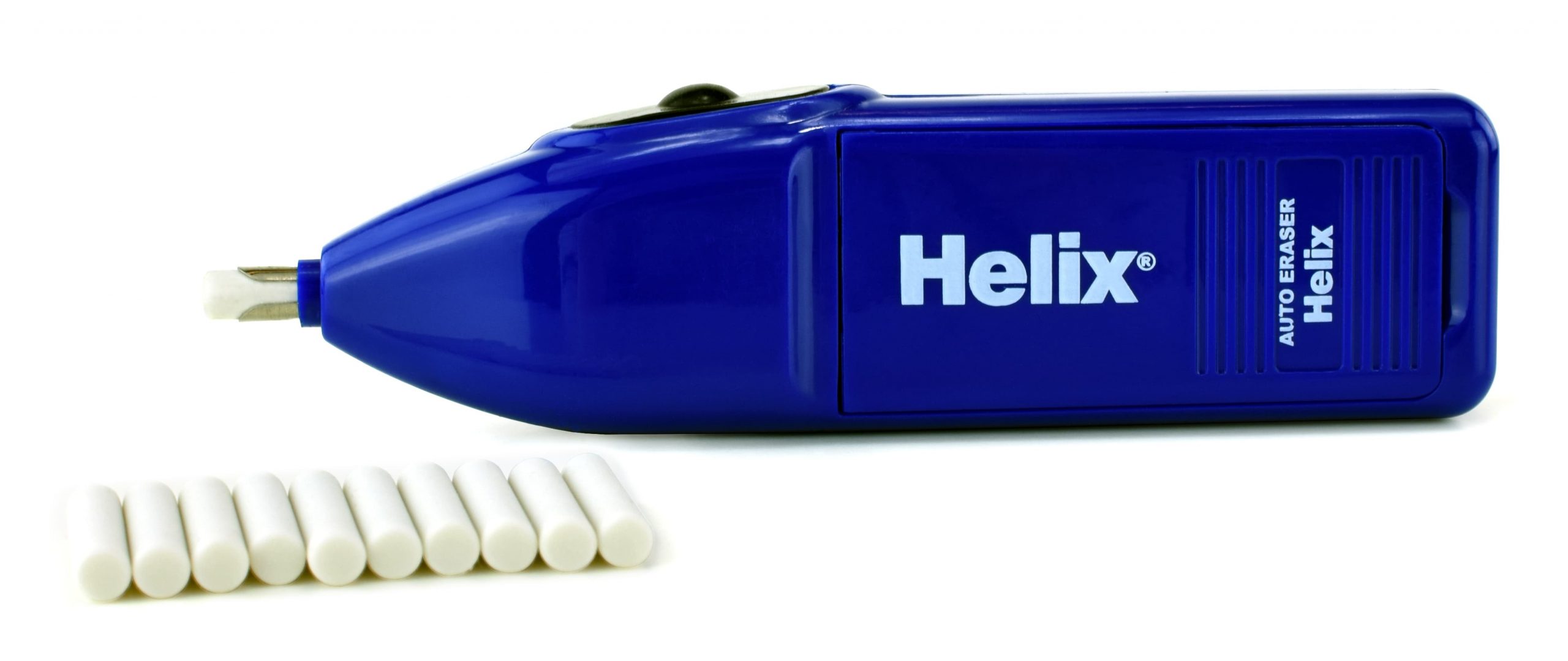 Perfect for artists, architects or anyone who needs help erasing! The Helix Professional Automatic Eraser is easy to operate with a push of a button, and the precise eraser refills make details a snap. The small eraser nub is great for removing small details and errors because the eraser spins rather than having to be rubbed back and forth. This compact and easy to use eraser operates on 2 “AA” batteries (not included). Comes with 10 eraser refills that are PVC, Latex and Phthalate free!