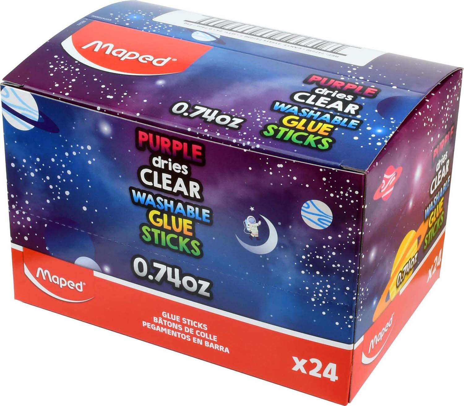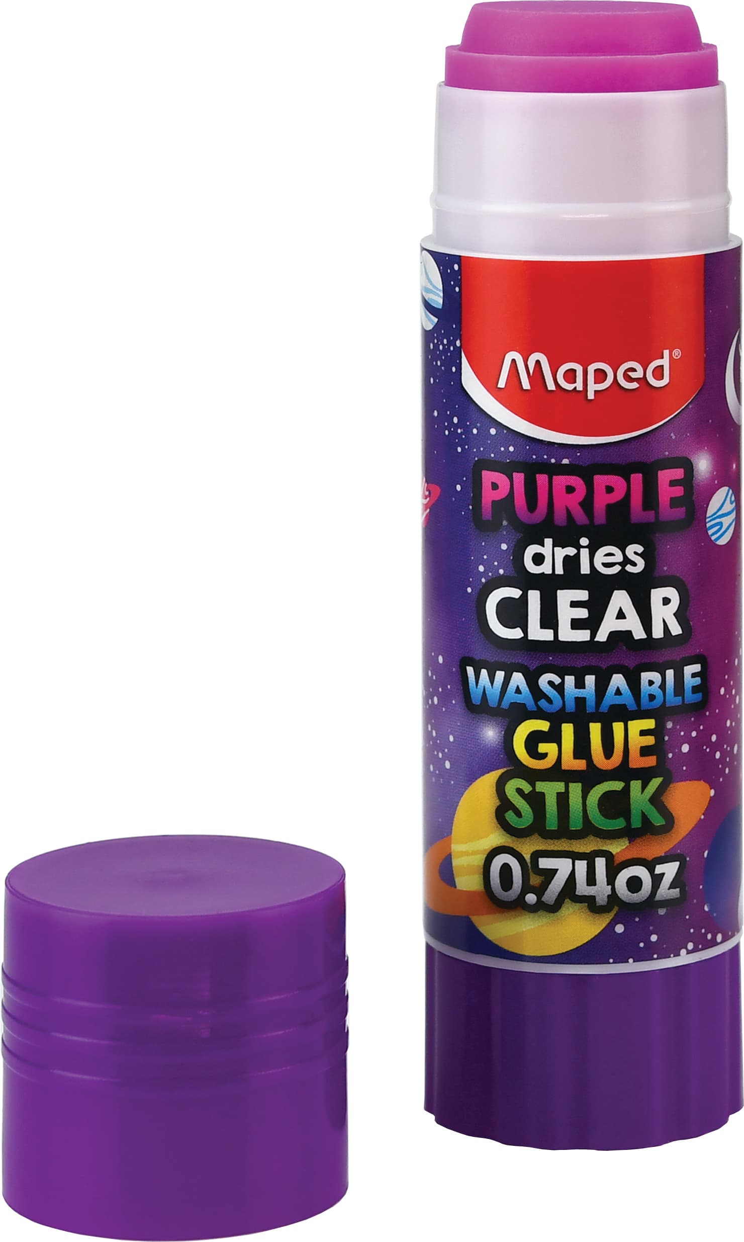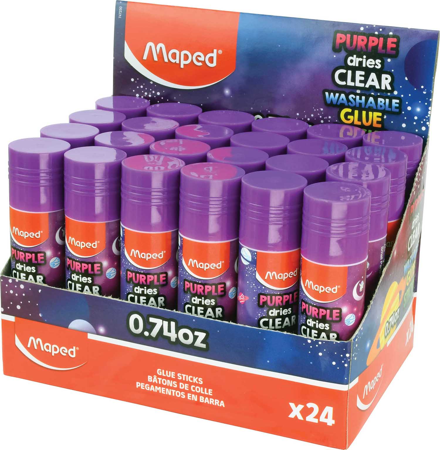 Maped Essentials Purple Dries Clear Washable Glue Sticks are a step up from your classic white school glue stick; the glue goes down vibrant purple but dries crystal clear! Premium glue holds strong and dries quickly on all common classroom materials, and the washable formula is easy to clean up with soap and water. Perfect for school, arts, crafts and more these large 0.74oz tubes are great for young hands to hold and are great at covering large areas. Safe, non-toxic formula quickly dries after application to secure. 24 piece display securely holds glue sticks in place with a tray so loose glue sticks always have a home to return to!