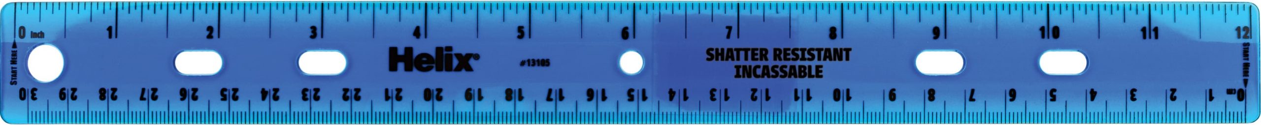 Classic 12″ / 30cm Ringbinder ruler, now made safer with Shatter-Resistant material! Unlike standard rulers that create dangerous shards of plastic when bent or broken, our Shatter-Resistant material is much safer if the ruler is broken, making it ideal for young students. And the translucent body means you can easily see what you are measuring for better accuracy with both Metric & Inch graduations printed clearly on the ruler. Integrated ringbinder holes and a large hang hole make this ruler easy to transport and store! Comes in assorted colors: Teal, Blue & Gray.