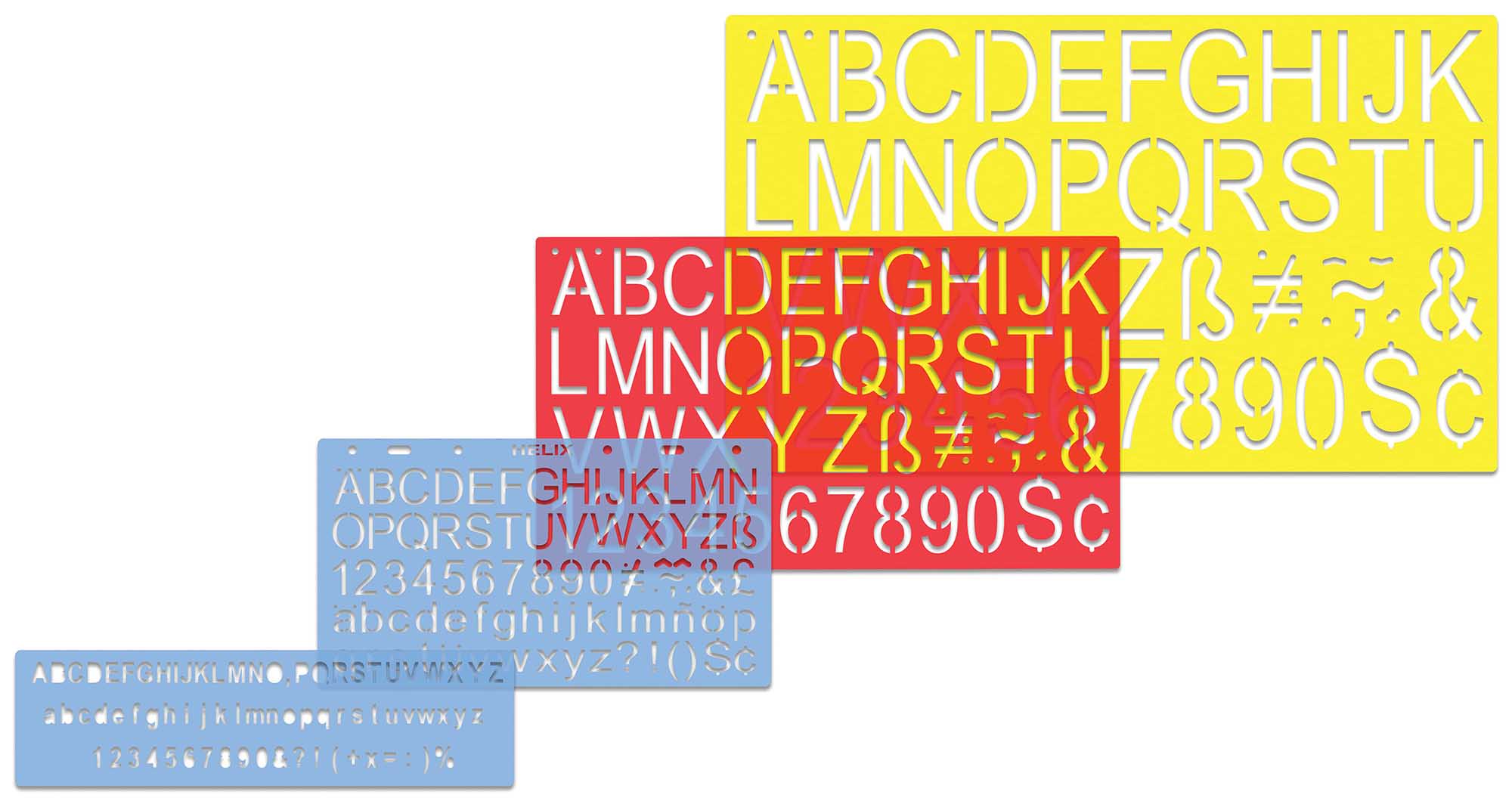Standard Font Lettering Guide Kit includes 4 plastic lettering guide templates in ½”, ¾”, and 1 ¼” tall font sizes! Each size includes Uppercase &, Lowercase Italic letters, numbers and common symbols! Vertical & horizontal guidelines help with spacing and ink risers on reverse side prevent smudging. Translucent plastic construction makes it easy to line up and space letters during use.