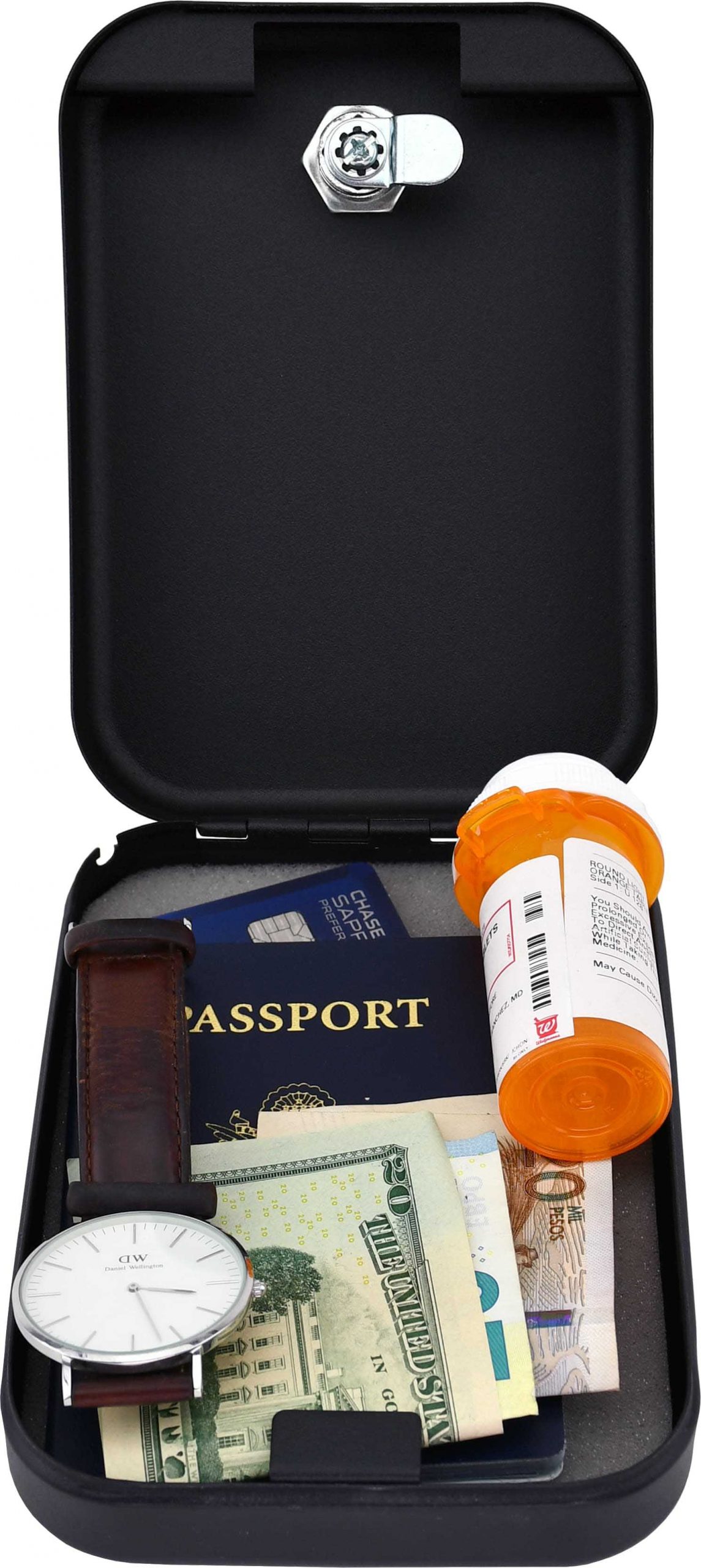 Made from high quality steel with a secure keyed lock, the Personal Safe is ideal for storing all types of valuables, documents, prescription drugs and more! Perfectly sized for business travelers, automobiles, dorm rooms, hotel rooms and more, the included steel tether easily secures the safe to any convenient post or frame. Soft-lined interior protects valuables from bumps and scratches! Dimensions: 4.75″ x 6.5″ x 2″ and includes two keys, steel tether and mounting kit.