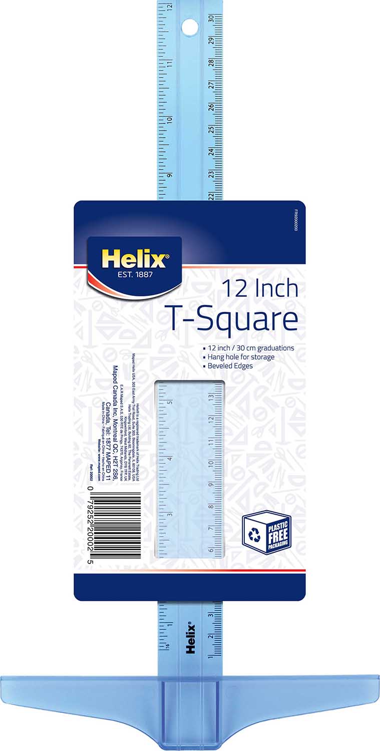 Lightweight plastic construction makes the Helix Plastic T-Square perfect for use around the home or office! Transparent material makes it easy to see what you are measuring with integrated Inch & Metric graduations printed on the blade. Features a hang hole for easy storage and beveled edges for clean, accurate lines. 12″ / 30cm