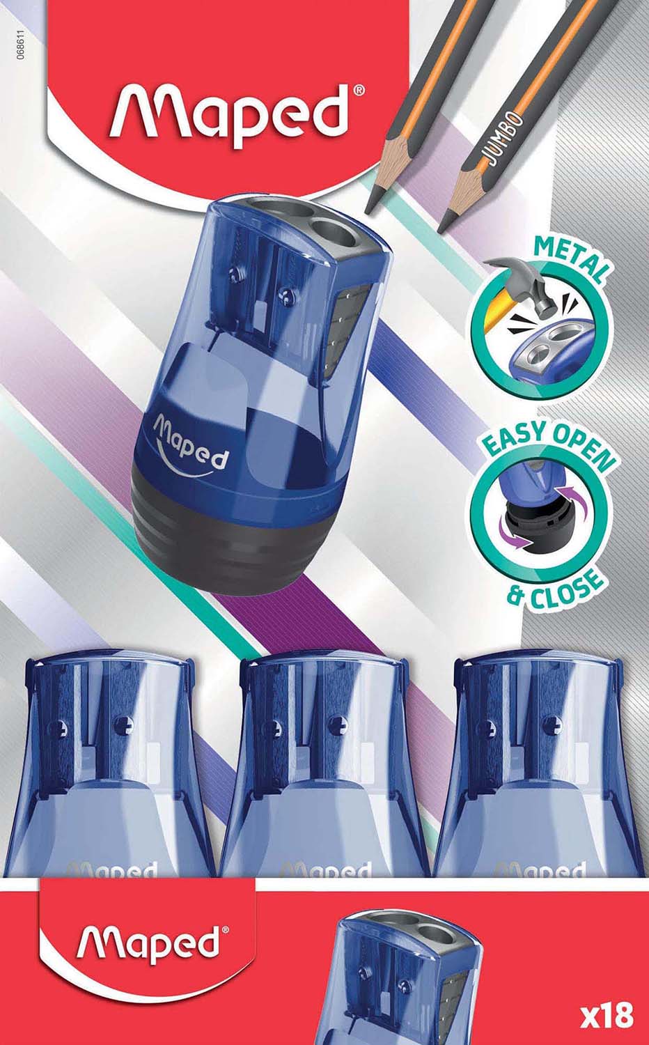 Totally redesigned, the compact Maped Tonic 2-Hole Sharpener easily handles standard or jumbo pencils of all shapes and styles and is compact enough to fit in even the most crowded bags and cases! The new wide, curved body is more comfortable to hold and the integrated shavings canister lid now unscrews from the bottom of the sharpener to keep the sharpener mess-free in pencil cases and desks. Sharpener features durable metal insert for smooth consistent shaving, and years of use! Translucent canister made with shatter resistant plastic for mess-free use and transport. Display includes 18 Blue single hole pencil sharpeners.