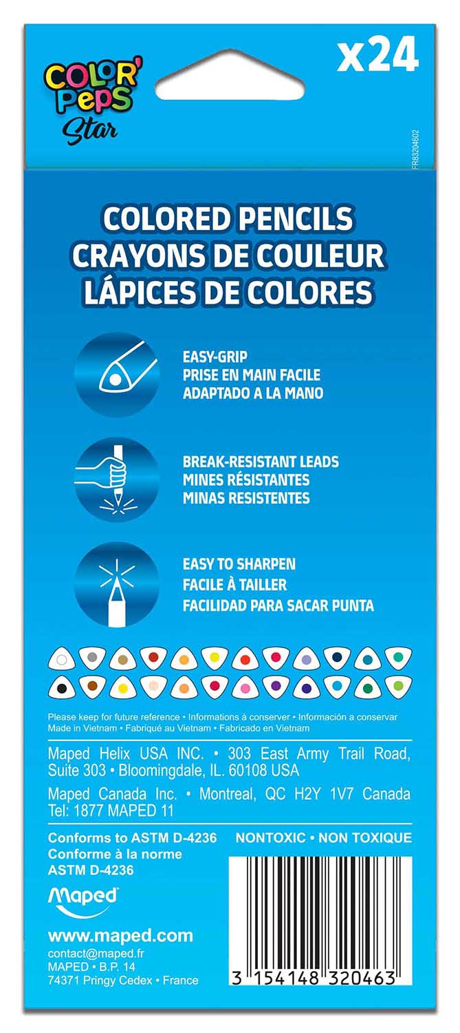 Bright & fun colored pencils provide hours of vibrant fun! Maped Color’Peps Triangular Colored Pencils feature a 2.9mm core with pigment that goes down smooth and but resists breakage, making them perfect for all types of drawing and writing. More comfortable than a standard pencil, the triangular body naturally indexes your fingers in the correct spot for more comfortable use and is recommended by teachers! The unique shape also stops the pencils from rolling when used on an inclined desk, while still sharpening cleanly in any standard pencil sharpener. This pack includes the following 24 colors: Dark Black, Xtra White, Silver, Gold, Dune, Woody Brown, Gaïa, Fruity Orange, Sunny Yellow, Fluo Yellow, Blush, Light Red, Red Kiss, Strawberry, Lovely Pink, Marshmallow, Eggplant, Deep Blue, Marina Blue, Blue Lagoon, Bubble Blue, Green Golf, Jade, & Apple Green.