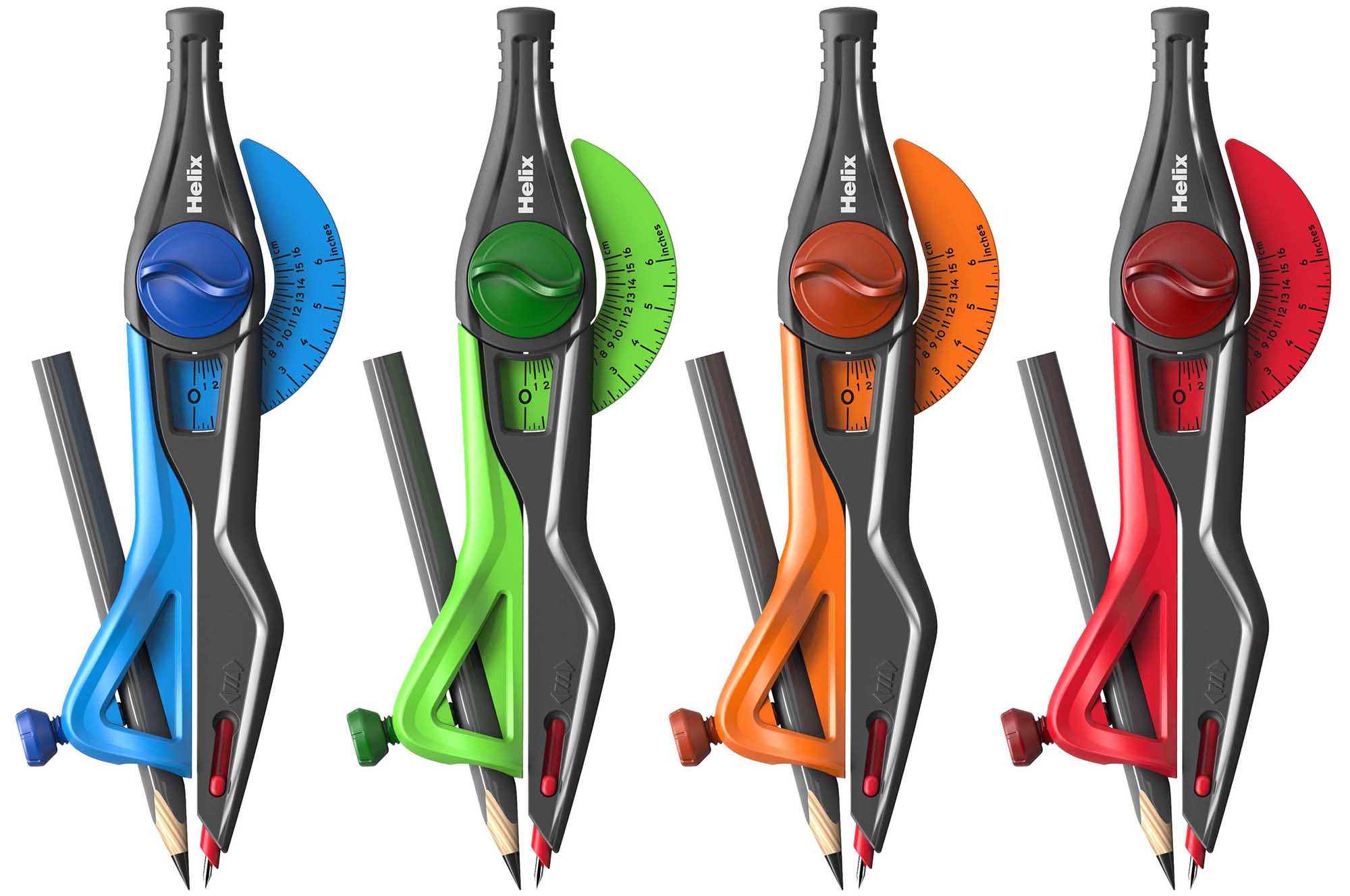 Modern, ergonomic compass perfect for all ages! Features a twist-lock secures the legs in place for accurate circle size and guaranteed precision. Innovative Safety Tip automatically retracts when you close the compass legs, to avoid potential injuries in a bag or case. Integrated distance measuring arm is graduated in both inch and metric. 50 piece bulk pack includes 4 colors (Blue, Orange, Red & Green).