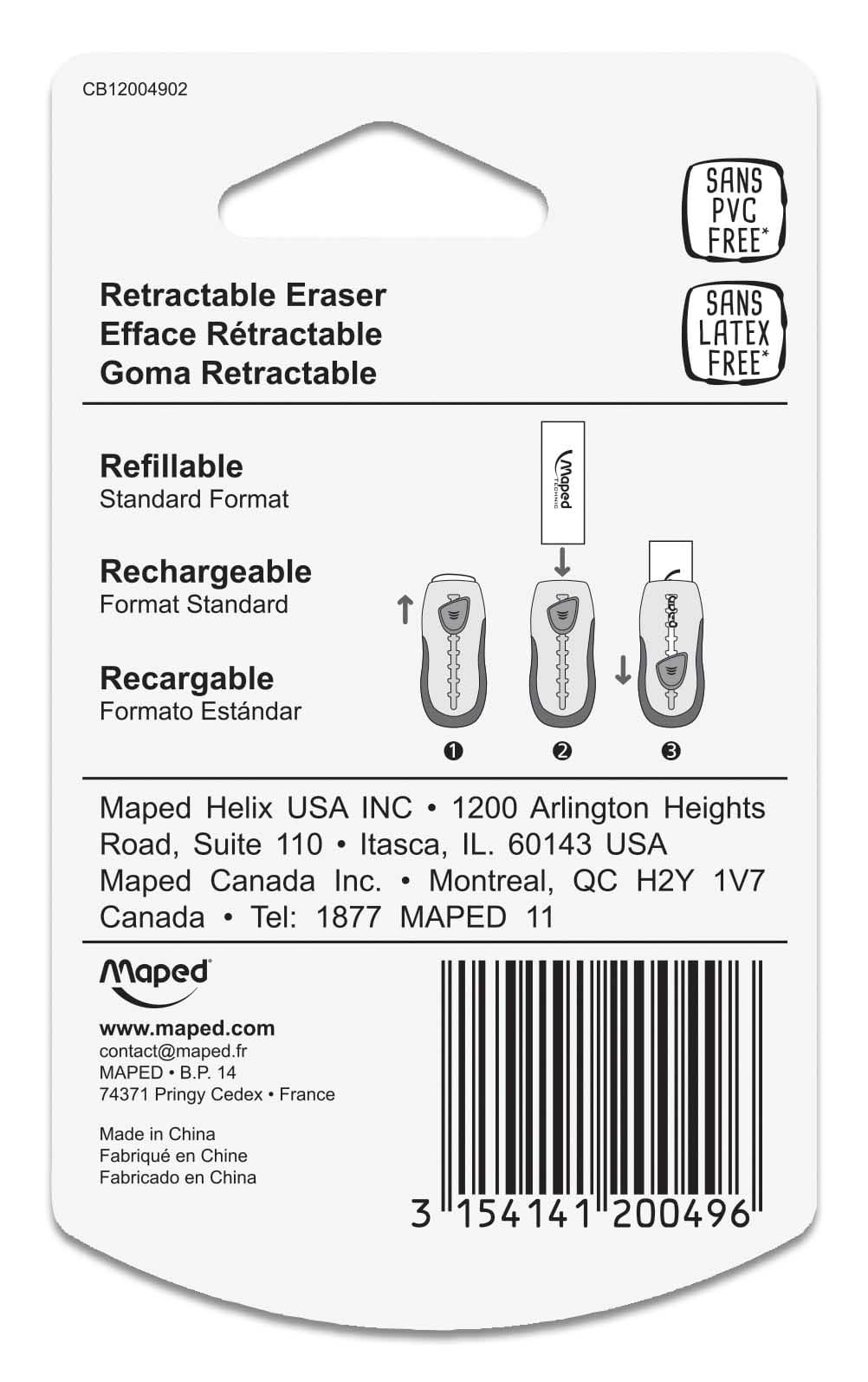Erasing mistakes are just a click away with the Maped Universal Retractable Eraser! Modern & stylish, the brand new case keeps the eraser protected and features an automatic locking mechanism that keeps the eraser exactly where you want it during use, and then quickly retracts for storage. The compact size is perfect for pencil cases and bags, and the high quality eraser is perfect for quickly correcting mistakes while writing or drawing and cleanly removes graphite with no smudging or paper tearing. Eraser is Latex, PVC & Phthalate free for safety and is refillable with any Maped Technic 600 Eraser.