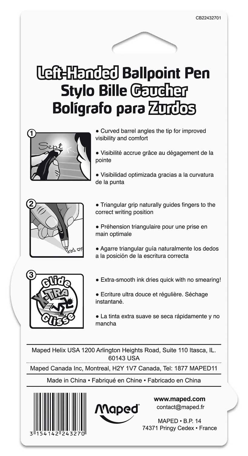 The first pen to offer left-handers more visibility as they write! The Visio Left-Handed Pen by Maped features a unique, curved barrel which angles the pen tip so left-handed users can easily see where they are writing without needing to ‘hook’ their wrist around. Comfortable, soft-touch triangular grip guides fingers into the correct position for a natural writing motion. Special quick-dry ink also helps against smearing when writing!