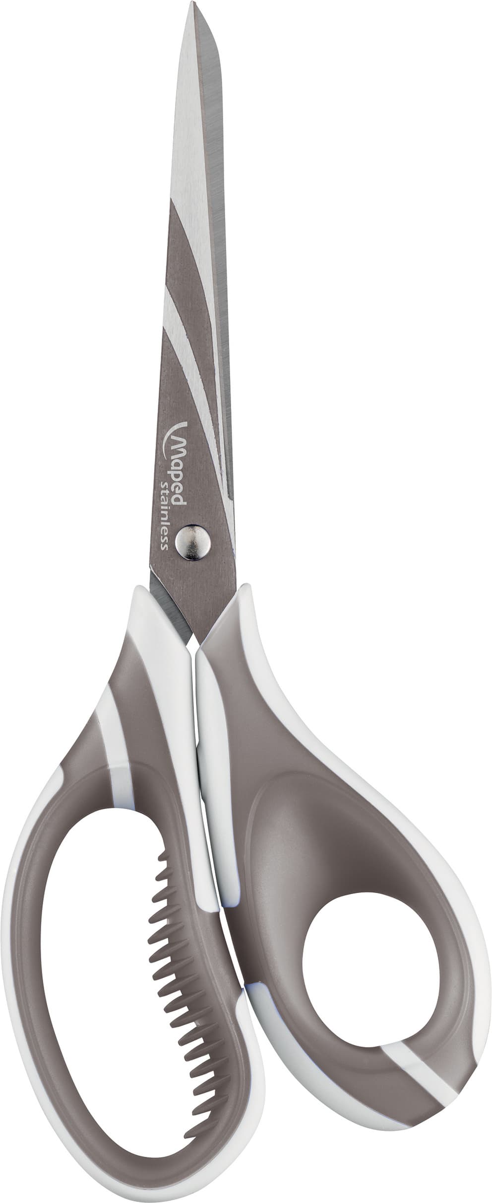 Stylish blade decorations and super-soft ergonomic handles really help the Zenoa Fit Scissors stand out! Oversized, soft-touch asymmetrical handles are comfortable enough for all-day use! The full-sized 8.25 inch blades give you plenty of cutting length, and razor-sharp edge makes quick work of all paper, cardboard, cardstock, fabric and more! Backed by a 10 year guarantee, the durable Stainless Steel construction will not rust or tarnish with age so you will always have a smooth and accurate scissor to get the job done. Comes in assorted colors: Blue & Grey.